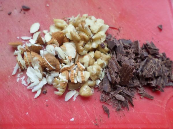 I slice the nuts and chocolate up very thinly, so together with the prunes the flavors of these things go all through out the rest of the fruit. I really like these ingredients and enjoy encompassing these flavors in each bite!