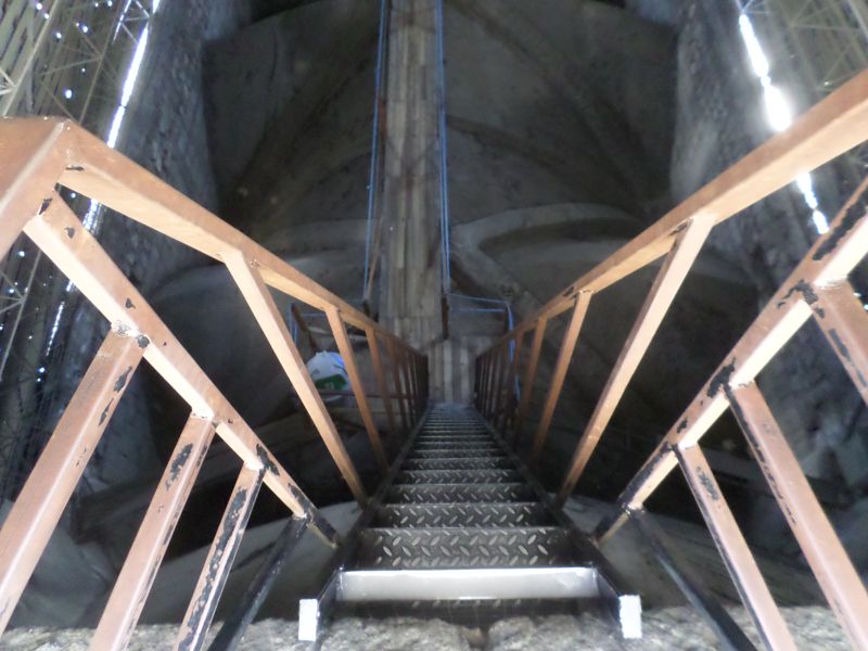 The wooden narrow catwalk shakes and creeks as we go across it. I try to climb the extremely vertical stairs while filming, but that was just too dangerous as I needed both hands.