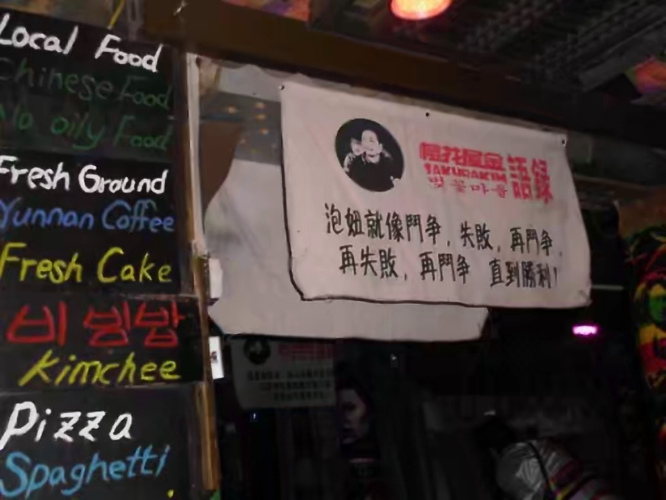 饭后我们去逛古城的四方街,也称酒吧一条街,那场景太嗨了,不只所有酒吧坐满了人,连街两边的石板路上都是人挤人。音乐的摇滚声,喝酒的呐喊声夹杂着游人的鼓掌声,汇成一片。灯红酒绿,酒吧里的男男女女借着酒精在疯狂,门口挂着各种将泡妞进行到底的语录。难道所谓的艳遇就是这样?我感觉这帮人有的只是颓废和堕落,甚至是放纵。于是觉得没什么意思,我逛了一小会儿便回客栈了。