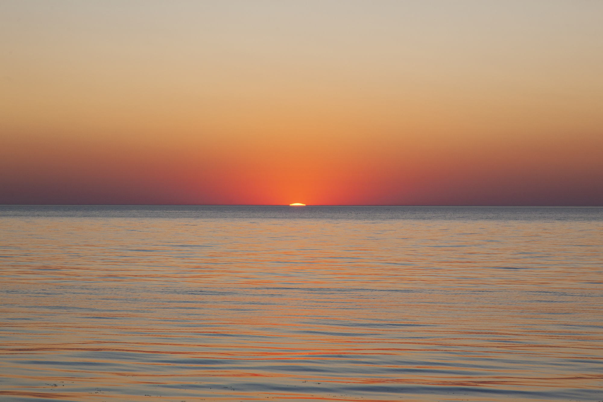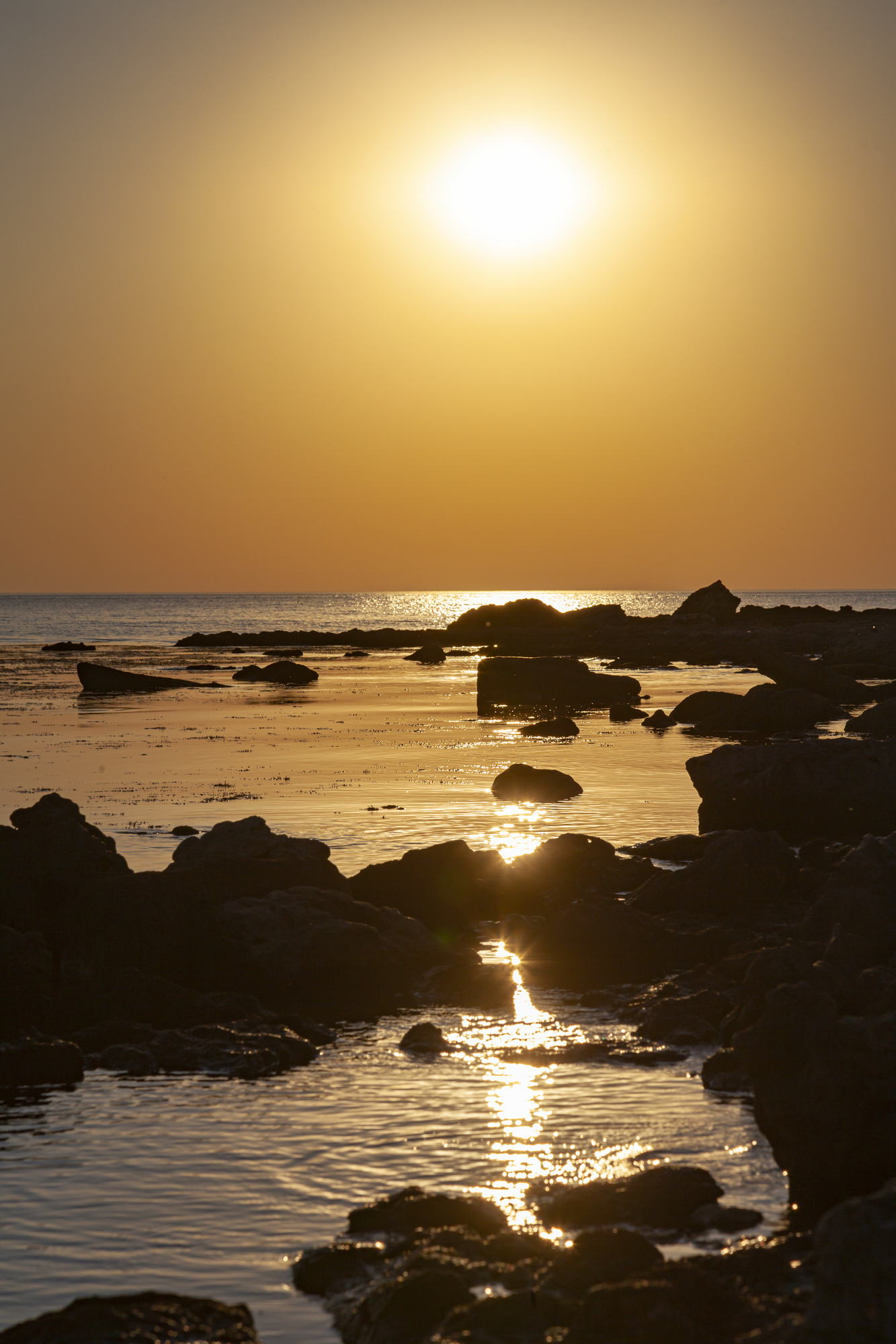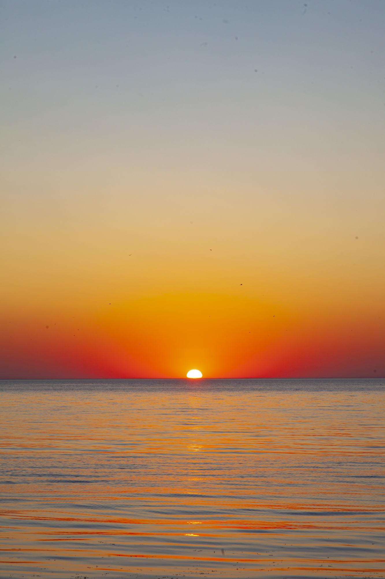 And so, I stand on black stones and watch the sunset. The majestic sight is enhanced by the absence of wind. The sea is almost calm. Light ripples on the water recede into the distance and on the horizon the yellow-white disc of the sun smoothly plunges into the dark waters.