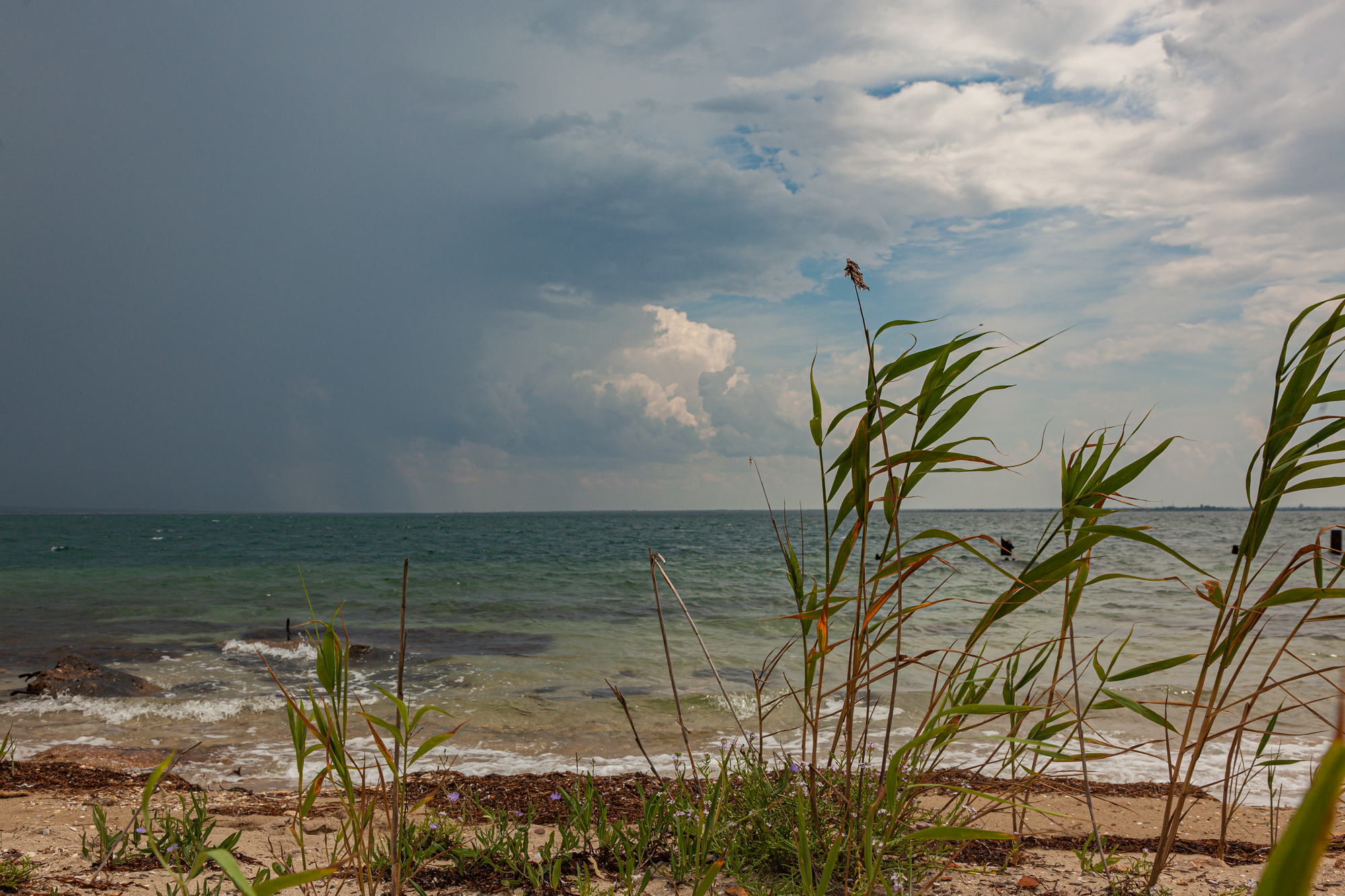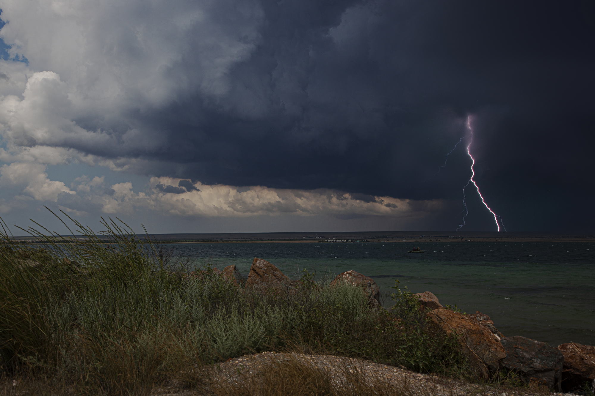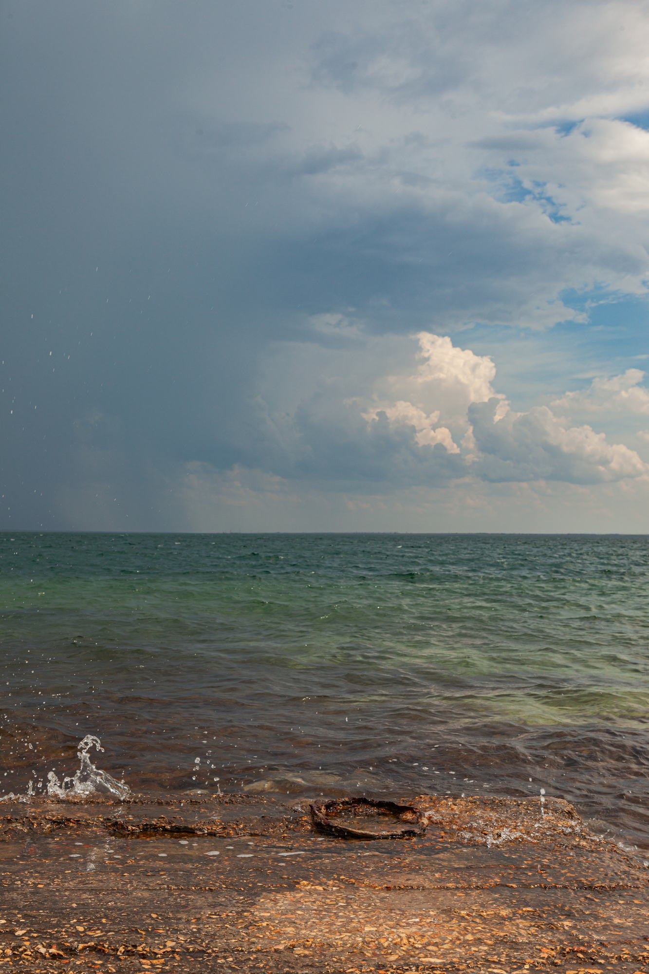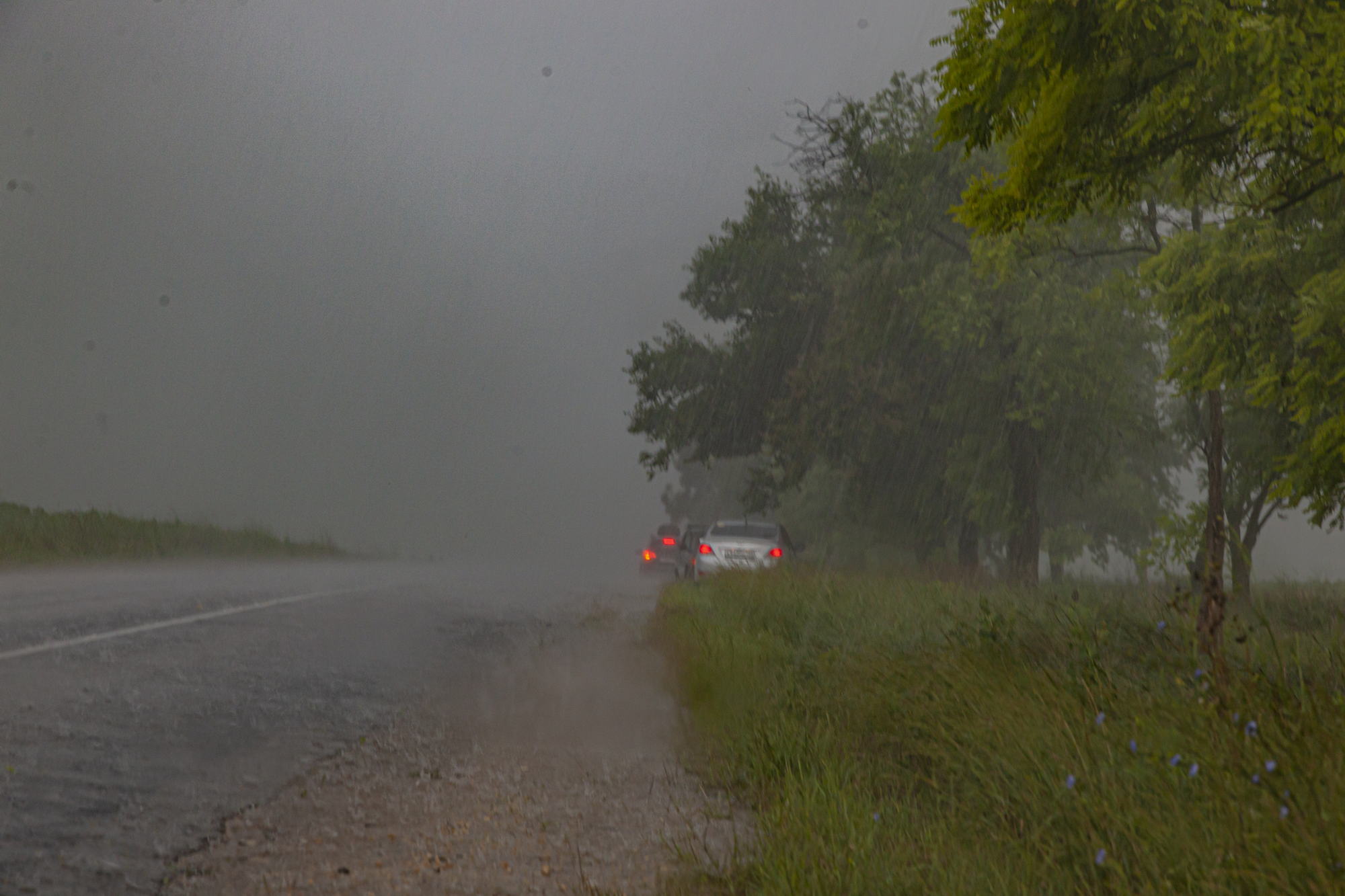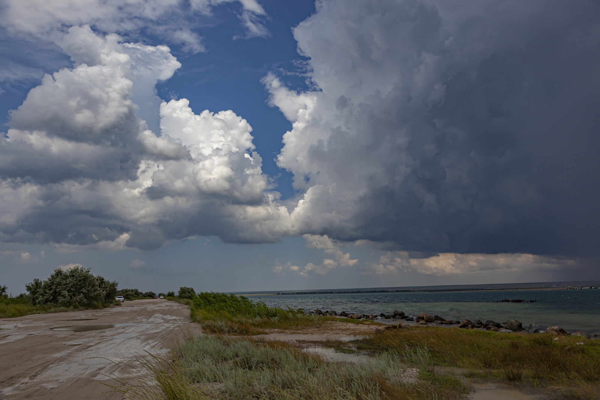 While we were walking along the spit, the wind caught up with clouds and a thunderstorm began. Lightning flashed at first across the lake, but then clouds began to press from the southeast and soon heavy drops of rain began to drum on the roof of our car. We set off on the return journey. On the way, we got to the epicenter of a thunderstorm, where the rain was replaced by hail. Visibility dropped to almost 5 meters.