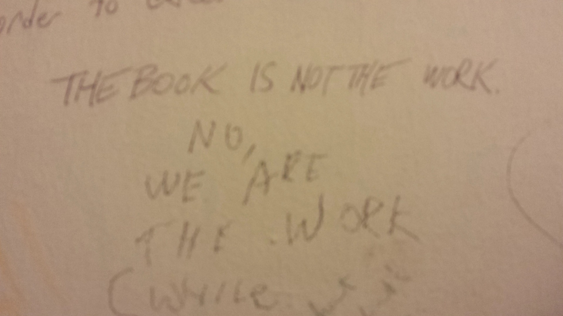 Another Goddardism: trust the process. Anytime the work you've set for yourself appears like too much: trust the process. When your advisor bashes the entirety of your work for a packet: trust the process. Part of me wants to strangle the mantra; yet, I refuse for the simple fact that to trust the process is to trust yourself. The process is you. To further emphasize this notion, I give you my favorite piece of graffiti written in the Music Building.