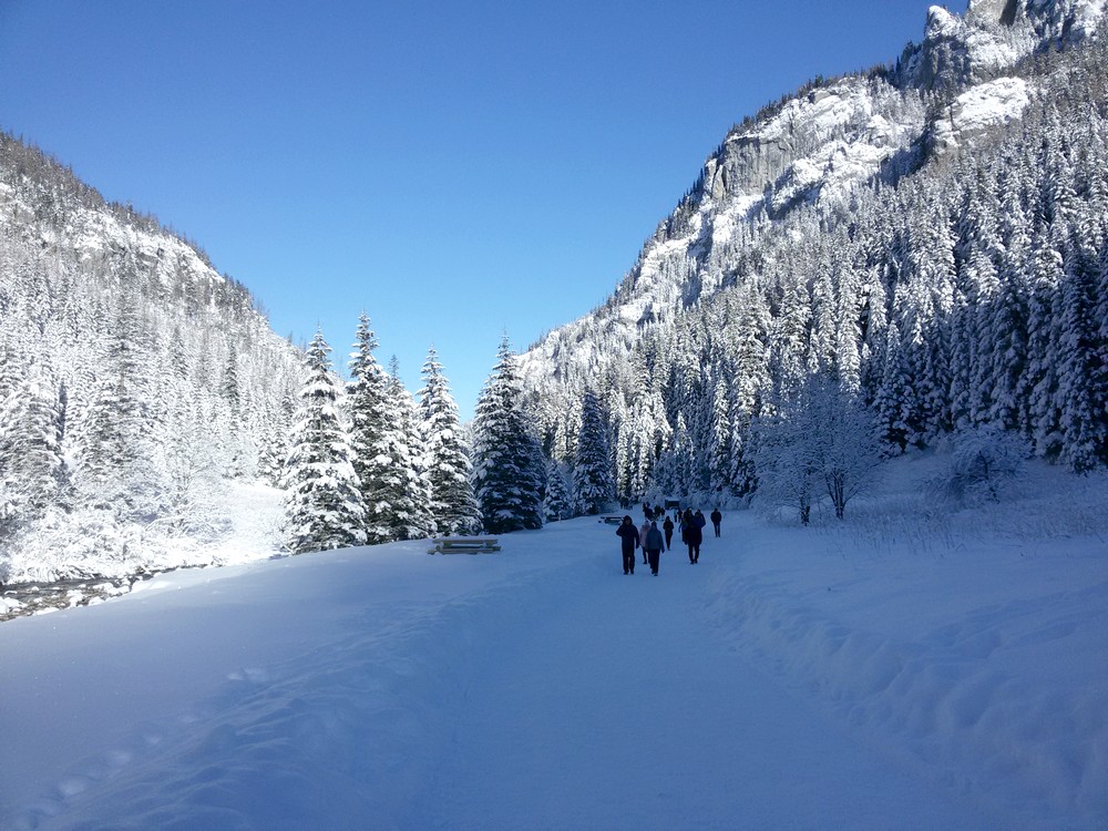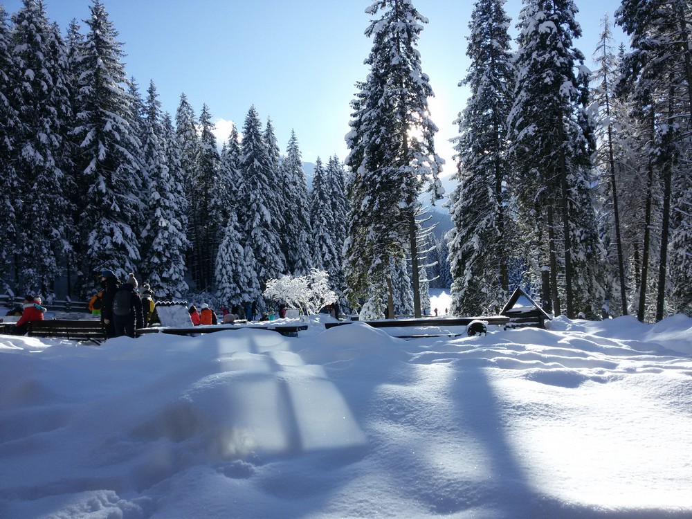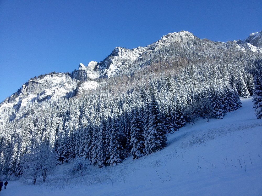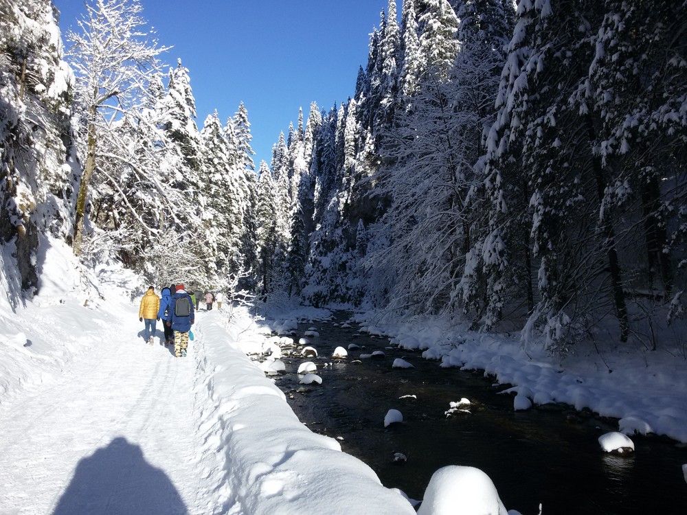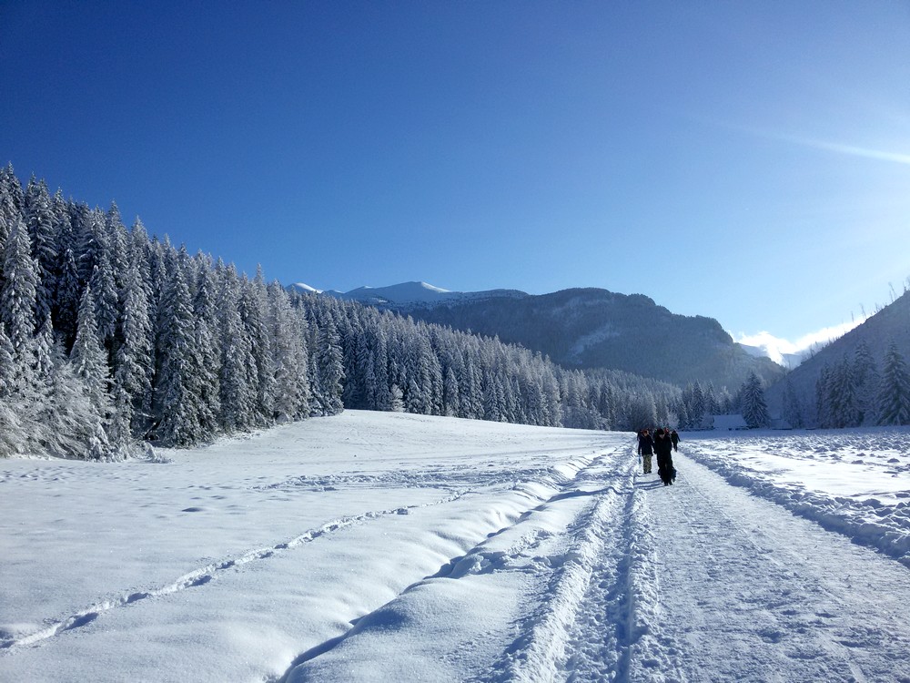 Kościeliska Valley is one of the most beautiful valleys in the entire Tatra Mountains. Its length is about 7 kilometers. In the summer, it takes about two hours to go one way. In winter, walk on the snow goes slower and it took us about 3 hours. At the end of the valley there is a mountain hostel. It was the destination of our journey that day. The path at the bottom of the valley is partly sunny. In places where the sun was not shining it was noticeably colder. As you can see in the photos, the sky was completely cloudless. Dream weather, it could have been just a little warmer.