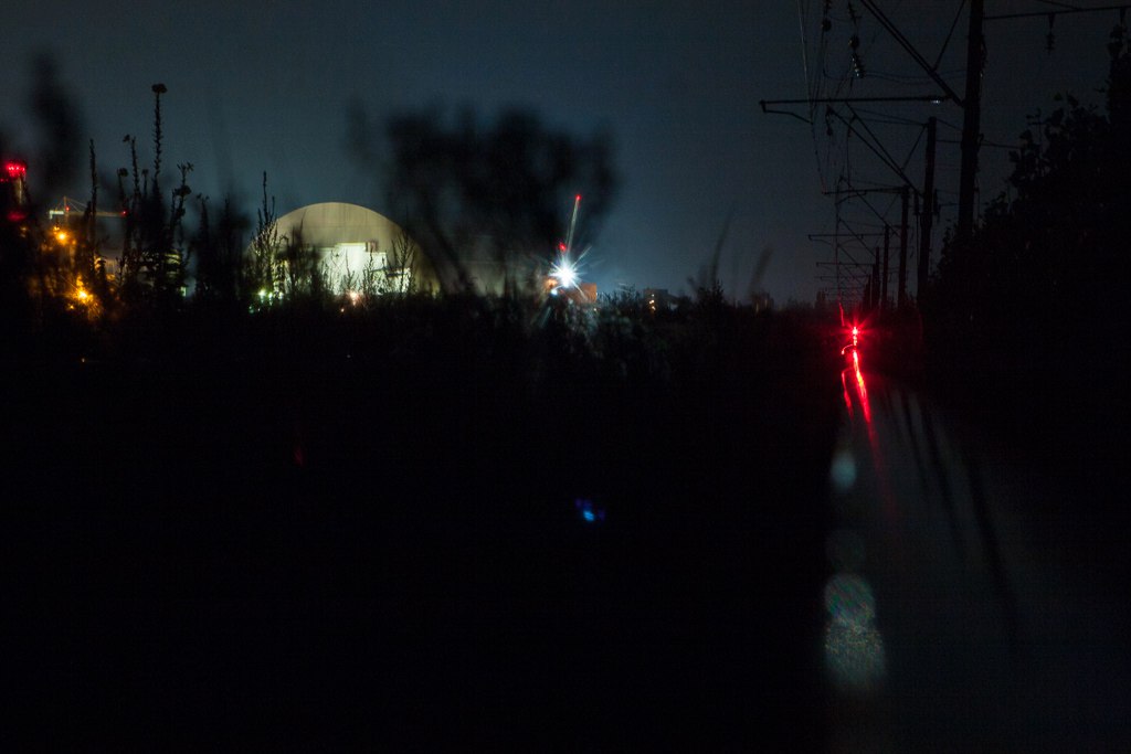 Over the Prypyat River, at the early dawn. Behind me - the lights of the Chornobyl NPP and the famous railway station Semykhody, used by workers of Novarka (the company that builds New safe confinement) and other working people every day.