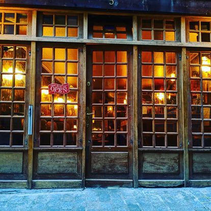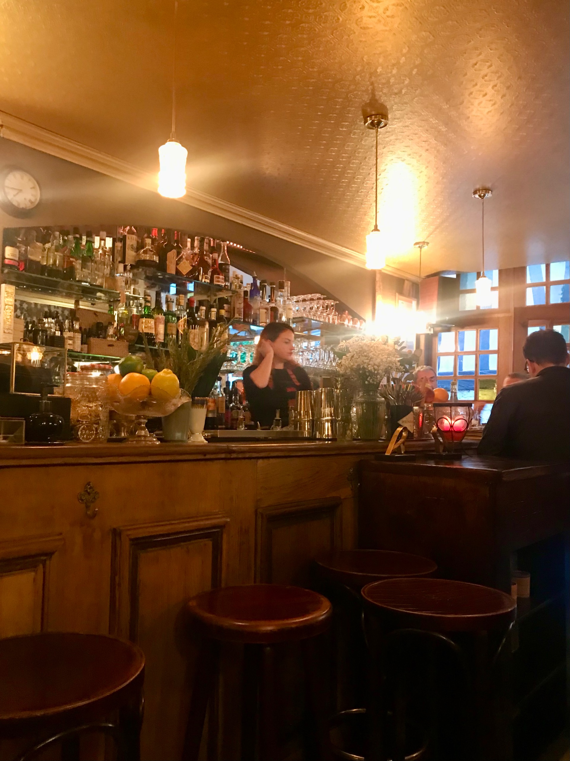 Running along one wall is a longspun, oaken bar. Behind it, the tools of their trade are displayed in front of mirrored glass under a gently arched recession. From the tin-tiled ceiling hang pedestal lights, the source of that amazing amber glow one sees from the street escaping through the double glass doors.