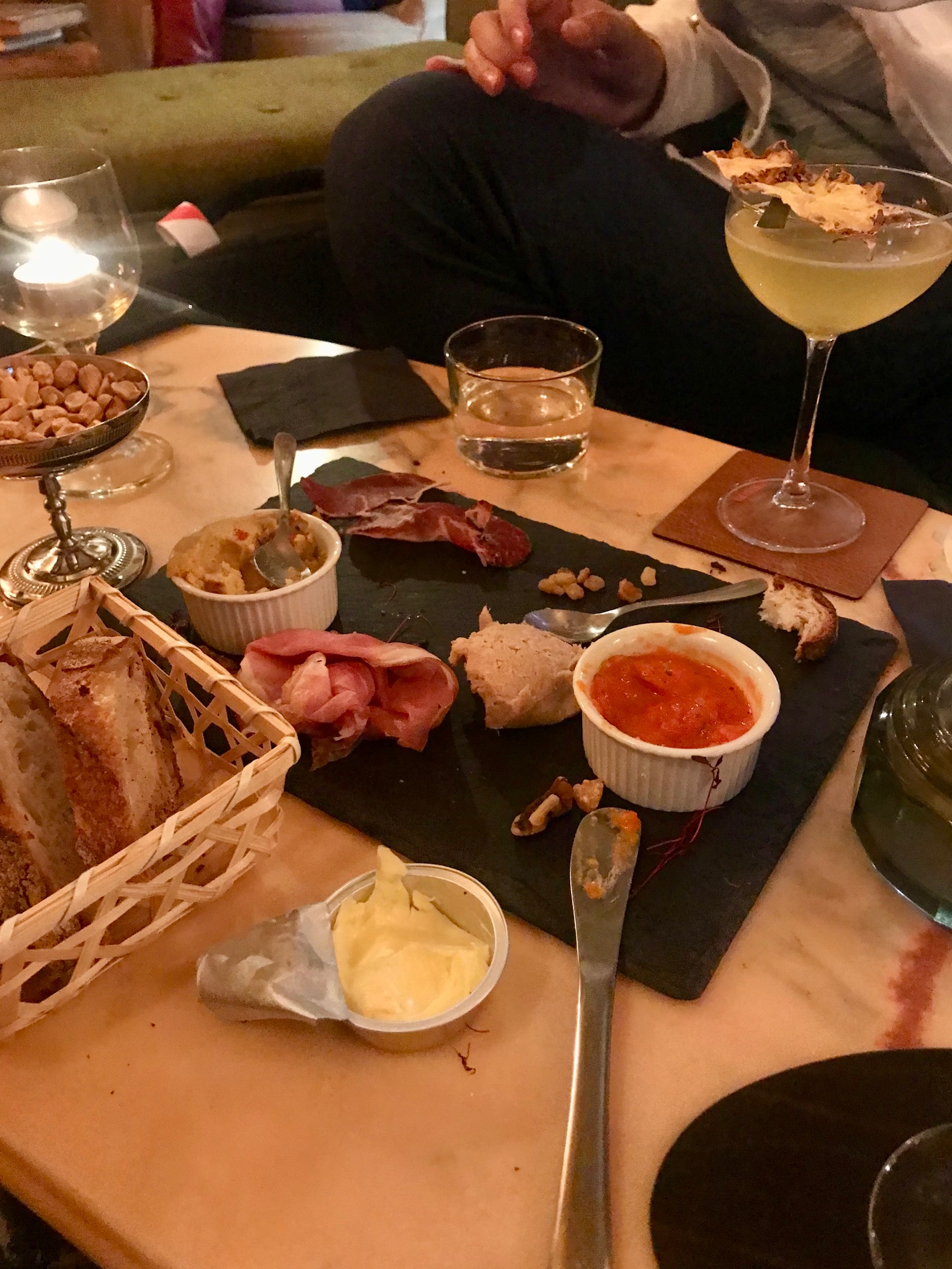 To my delight, a charcuterie is soon brought to the table. Le Petit Bar goes all out in French style, presenting us with a selection of hard and soft cheeses, meats, hummus, bread, and other elements.
