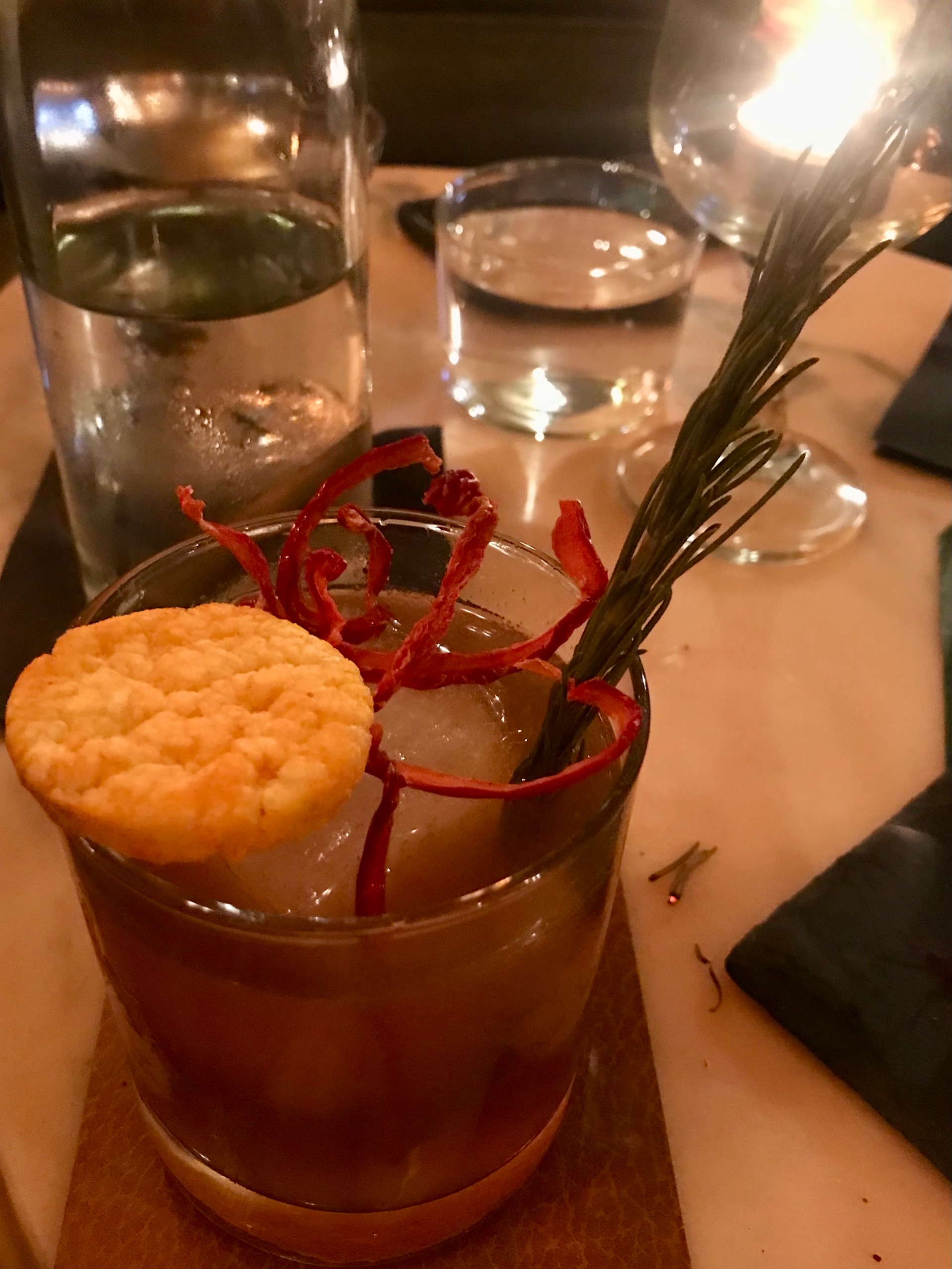 My daughter promptly orders a Mayahuel. This tequila and lime cocktail, an obvious take on a Margarita, features a large sprig of fresh rosemary popping out over the rim. And, it's on fire. The barman creates a smoky, herbal contrail that extends from the bar to our table.