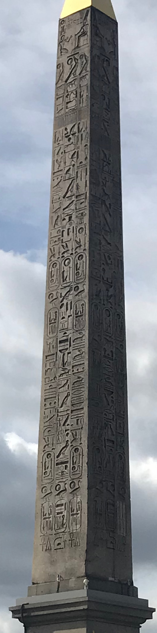Even more strange, in my opinion, is the gold leaf cap that the French installed atop the obelisk in 1998. The newness of the topper seems to contrast and conflict with the antiquity of the stone pillar. Cap and post combined, the Luxor Obelisk stands over 100 feet.