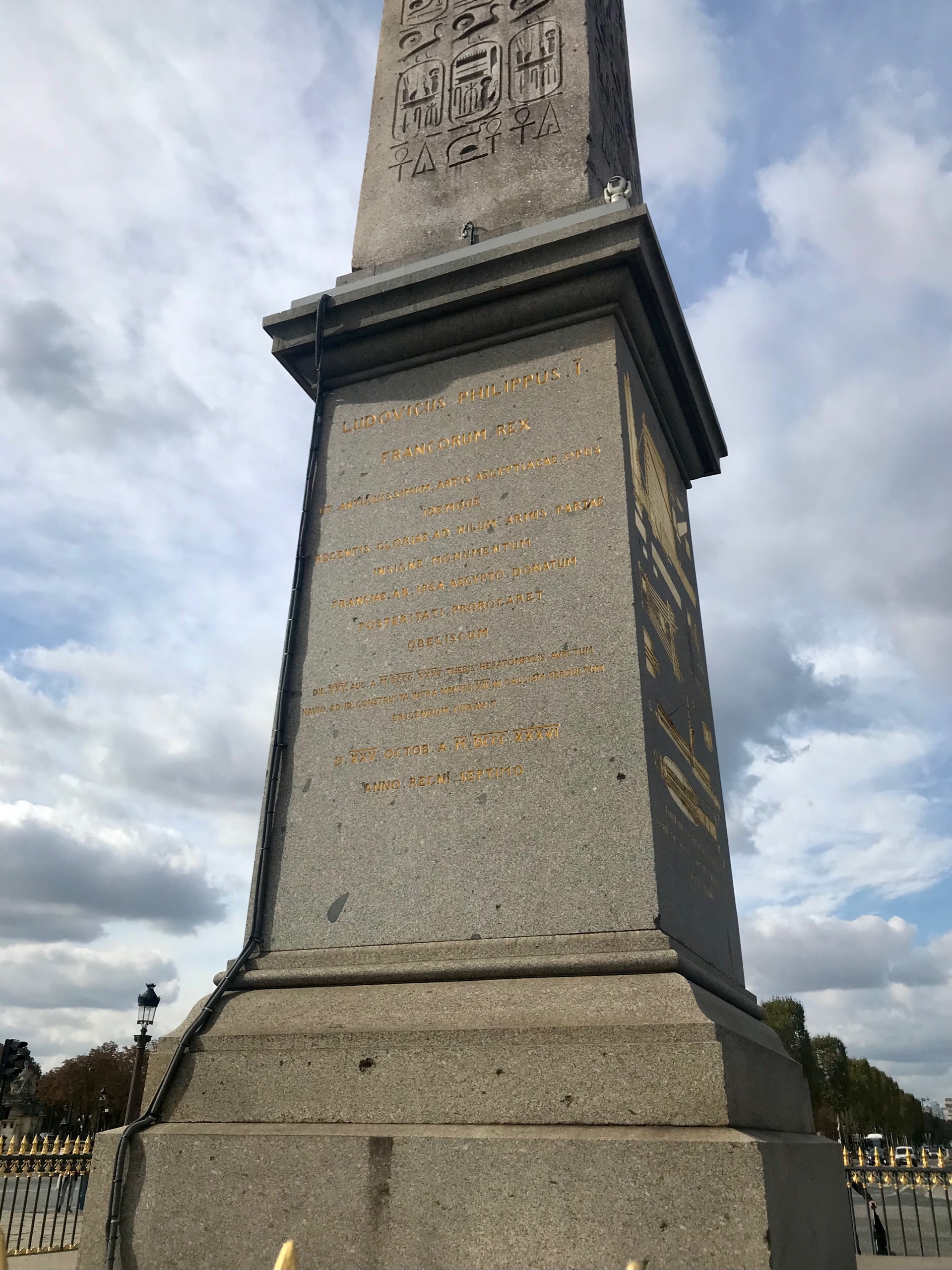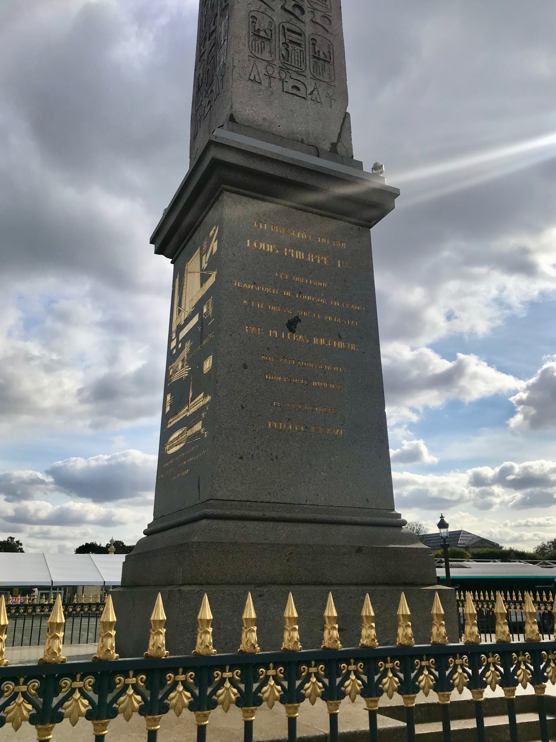 Beneath the pillar is a four-sided pedestal. On two sides, a gold inscription in French dedicating the Luxor Obelisk in 1836. However, on the other two is a pictorial representation of how the obelisk was taken down, transported, and then re-raised in the Parisian square.