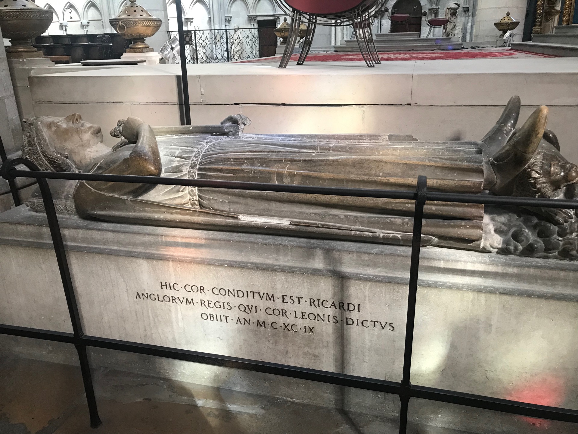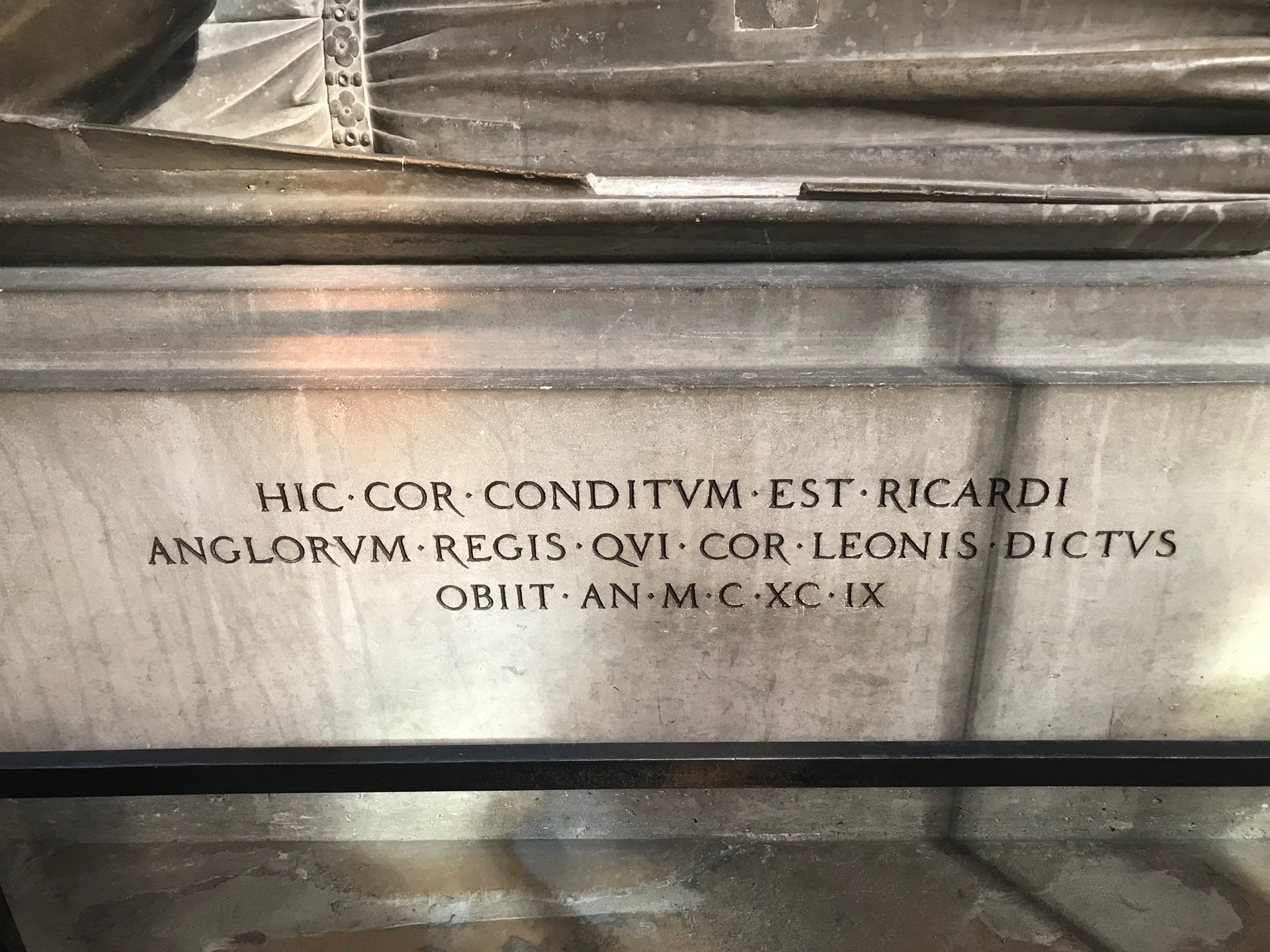 The stone tomb bears the inscription: "Hic cor conditum est Ricardi Anglorum Regis qui cor leonis dictus obiit an MCXCIX."