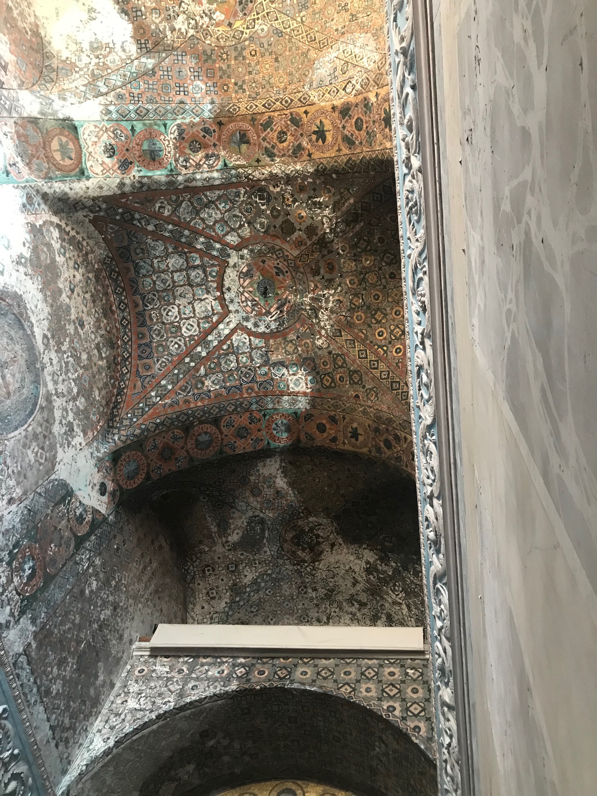Overhead, elaborately painted designs in gold, teal, and earth colors decorate the ceilings. These designs, nearly 1500 years old, show the wear and tear of the elapsed centuries. Still, they remain a commanding presence in this space. There is a simple, almost crude, element to them compared to Turkish tile's rich perfection in other mosques. Handpainted and lacking the ideal of contemporary machine-made patterns, these ceilings have still outperformed and outlasted most modern-day constructions that would rival them.