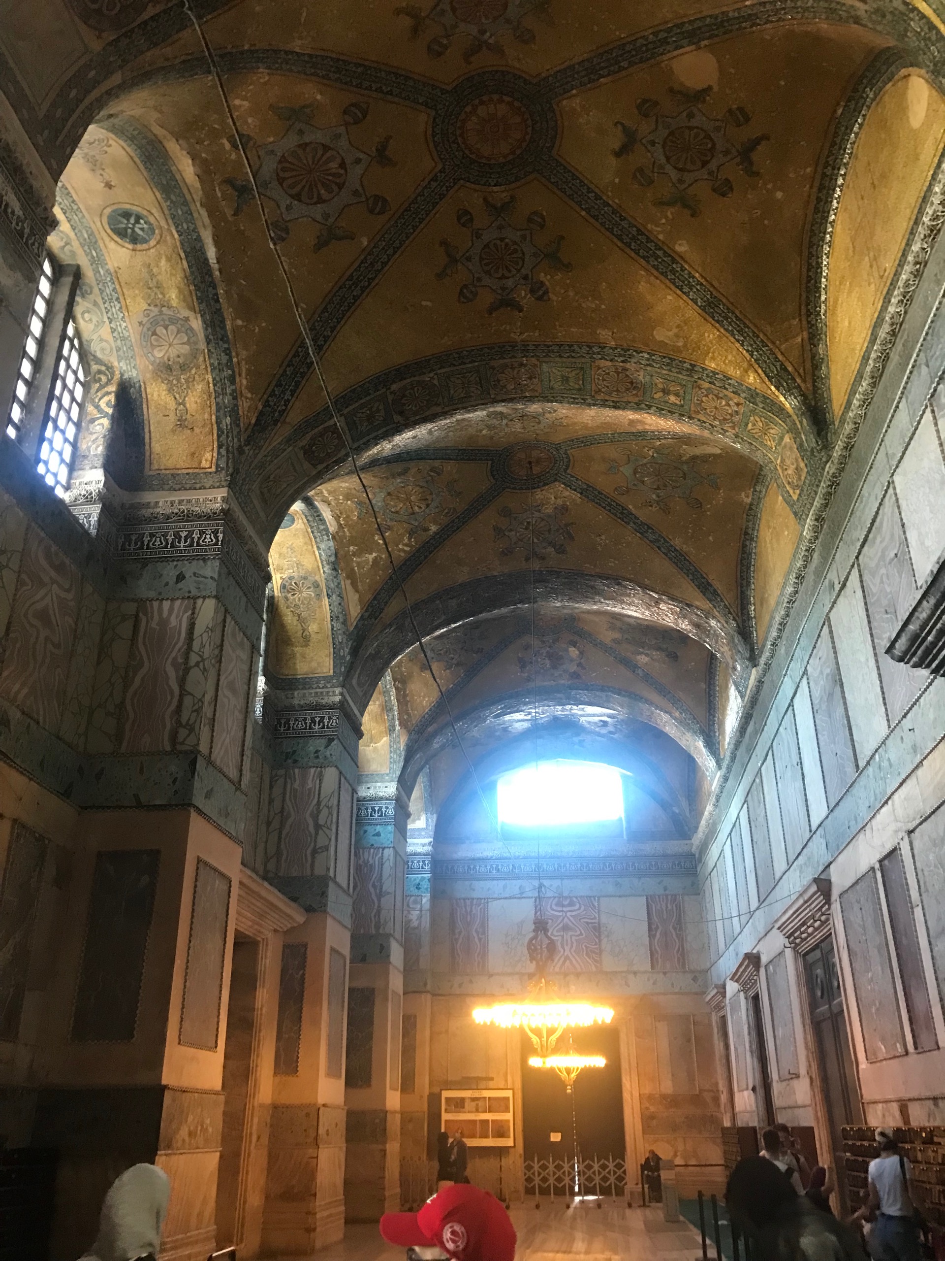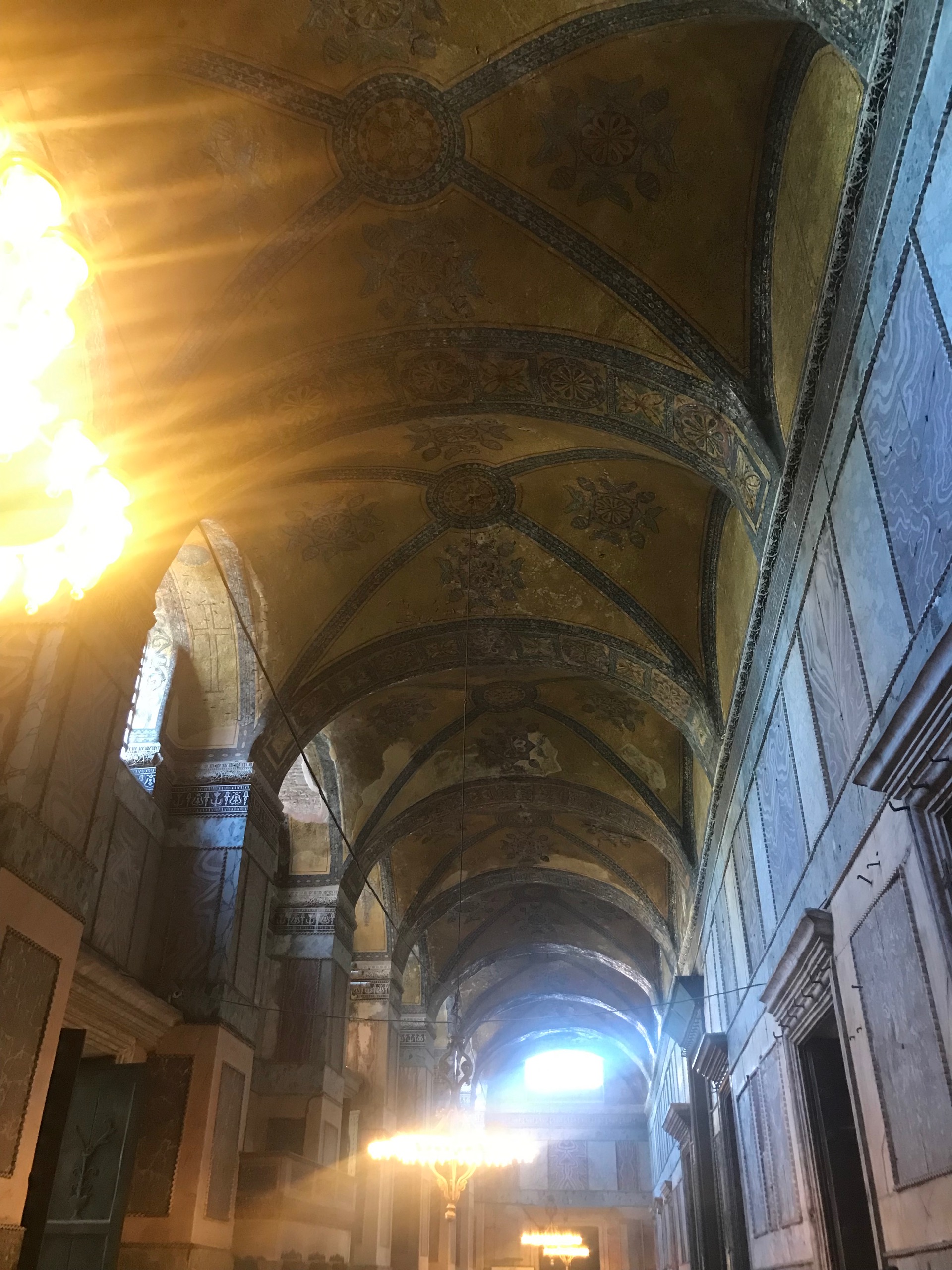 And as I saw inside for the first time, most prominent were a dozen round, multi-lamped chandeliers providing golden rings of light. They cast a rich, haughty air to the scene. Hanging low and bright, they served to magnify the magnificence of the domed ceilings of this ancient place.