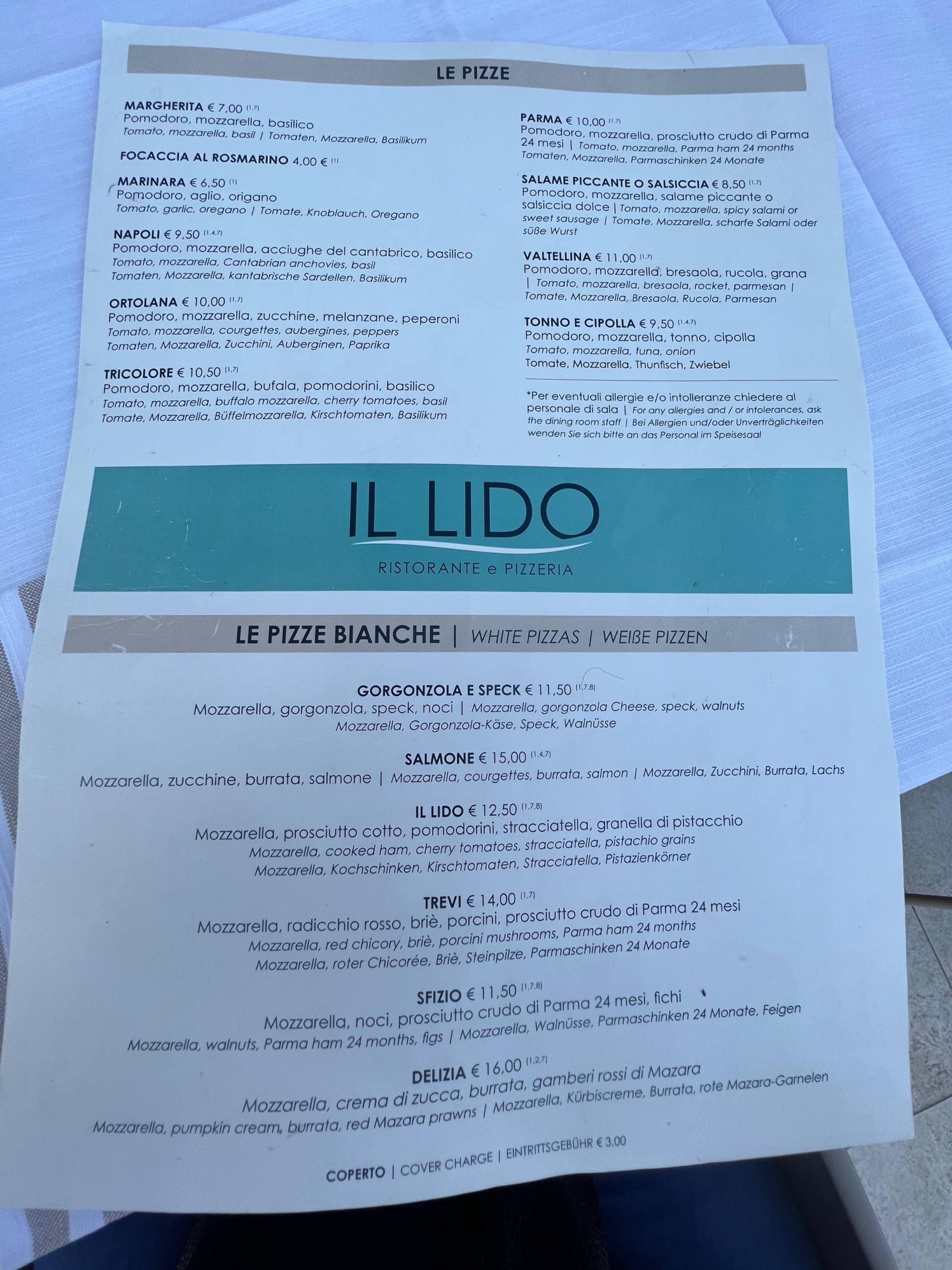 The restaurant and prices were better than we thought. When you are in Italy in the lago di Garda go to il Lido. Its in a town called Gargnano.