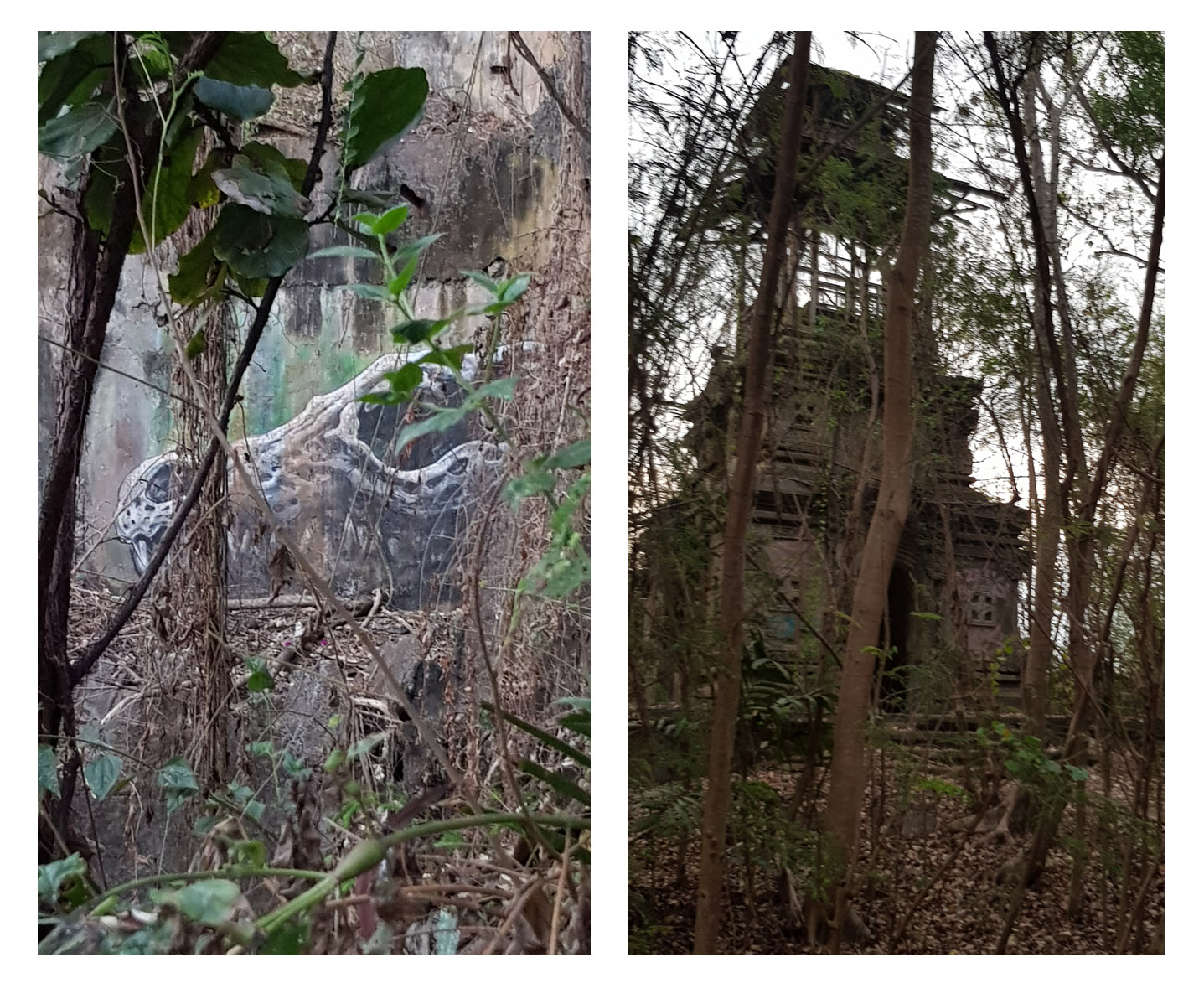 There was less concrete here and more jungle than ever. Dirt paths lead in all directions and more dilapidated buildings with wildflowers growing all over. The sun had began to sink further down in the sky and It became clear to us both that we had underestimated the size of this place. There was probably not enough time to explore all we wanted. With the fading light we ventured deeper still and explored the abandoned structures we found.