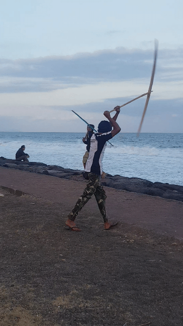 The Taman Festival was actually build right by the beach. We passed the obvious main entrance and an eerie melodic droning could be heard. There's plenty of parking so I set the bike by the seawall. The eerie droning got louder and on the beach we discovered its source.