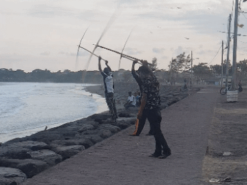 The wind was coming on strong from the sea, perfect for the kites soaring high above our heads. Even more perfect for the 10 odd or so men pushing giant propeller blades toward the sea. A few local men sat on the grass carving and sanding massive wooden propeller blades. They would look over their blades and after giving a satisfied nod, would get up and put it to work against the heavy sea breeze. The frequencies varied and produced an odd symphony that echoed in the air. We were baffled at such an amusing sight. I turned around and looked at the menacing entrance to the Taman Festival and wondered if they realized their fun was setting up such a perfect mood and tone for where we stood and planned to enter.