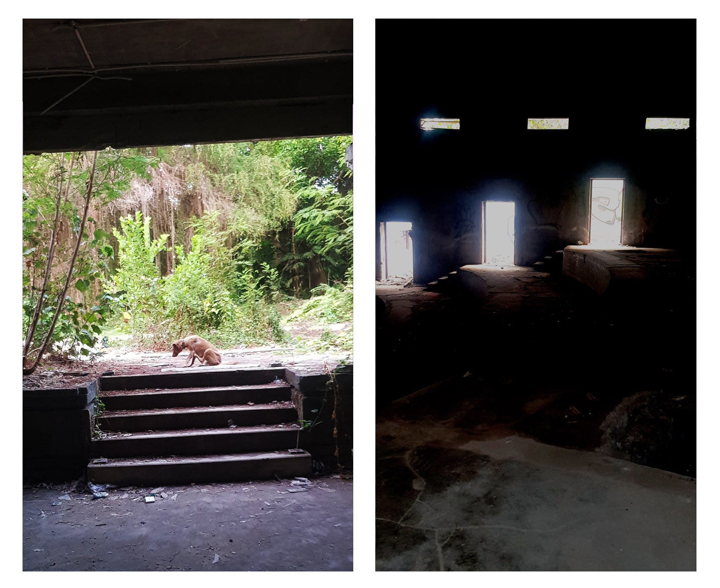 As expected the theatre was empty! The seating looked cold and uninviting. Bright sunlight was streaming through the open doors and windows. Butterflies and birds darted in and about messing with shadows. We found some stairs leading up to the projector room. Looking down into the theatre looked even more uninviting from the top. We continued exploring into deeper and darker rooms when Isabella let out a terrified shriek. She popped out from a door and I couldn't help but laugh. A dog ran out into the sun and the two took a moment to regain their composure. I wasn't looking to backtrack into the theatre so we found a back exit where I imagined kids would try to sneak in from if things had panned out differently.