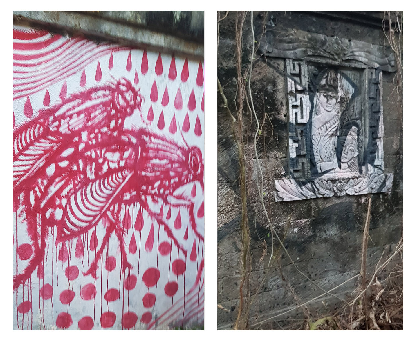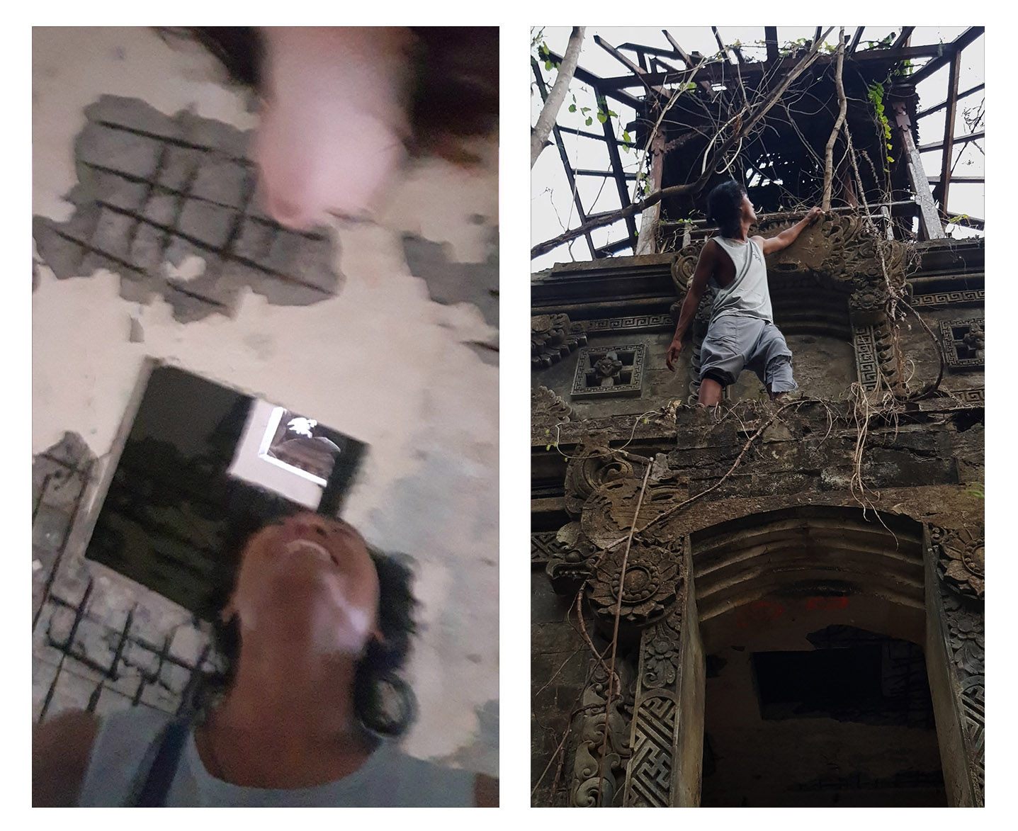 The opening was overgrown with enough vines where we had to push our way through. We must have disturbed some chickens mid shenanigans cuz they al took off into the bushes.