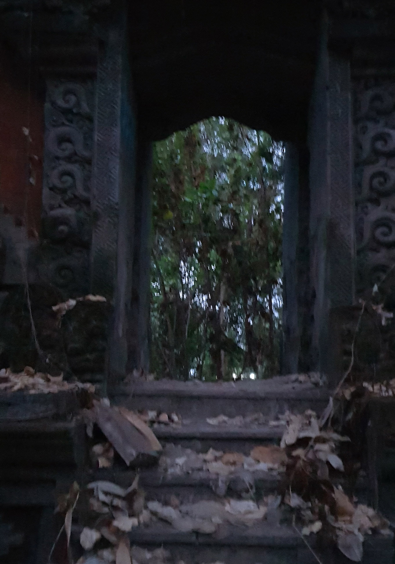 Creepier paths presented itself that really drew our curiosity. The darkness was really taking over so we needed to find an actual way out. A mossy gate caught my attention and beyond that what looked like light was shining through. There wasn't much of a path but I had a strong feeling we could leave from there.