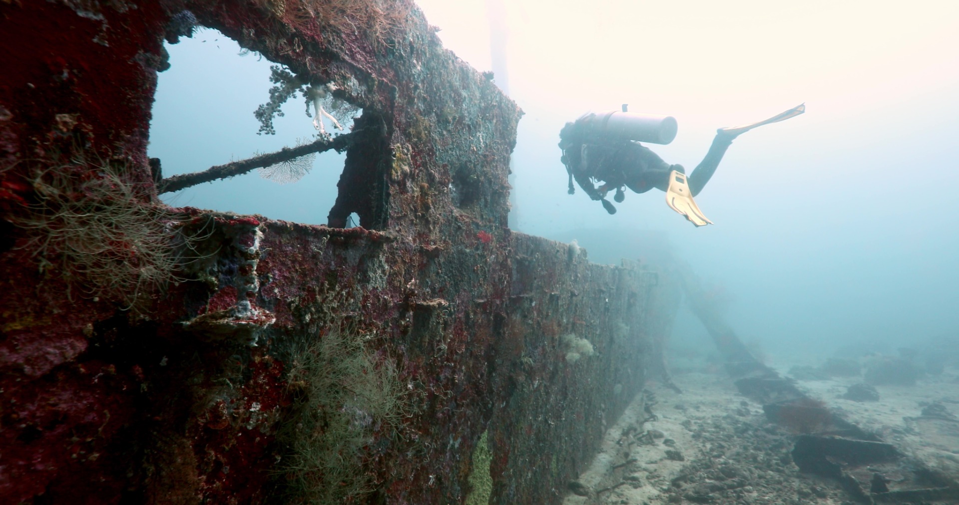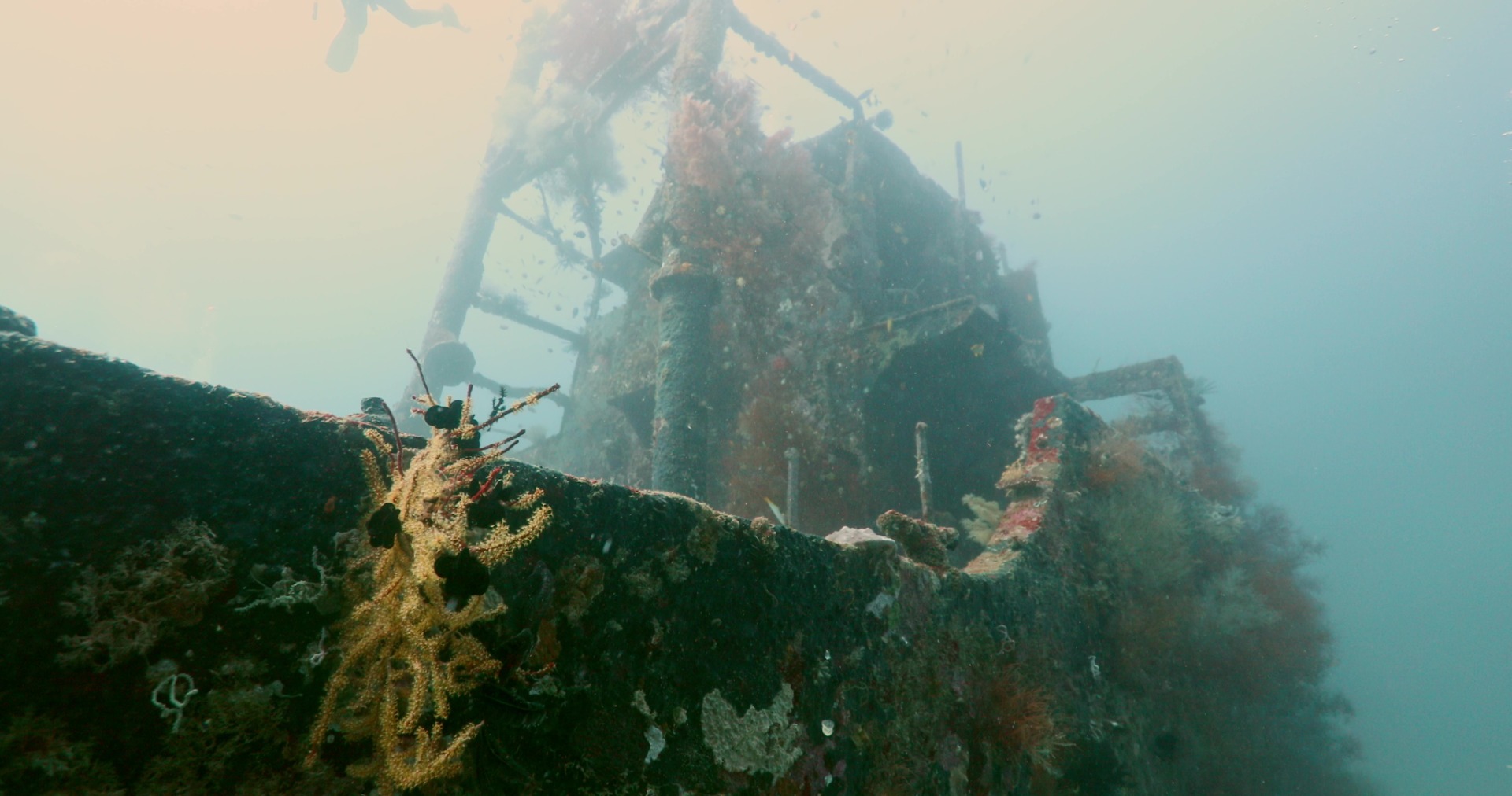 Descending into the blue, we are greeted by an otherworldly scene. The shipwreck's structure looms before us, covered in vibrant corals and encrusted with marine life. Schools of fish dart in and out of its crevices while colorful reef dwellers go about their daily routines.
