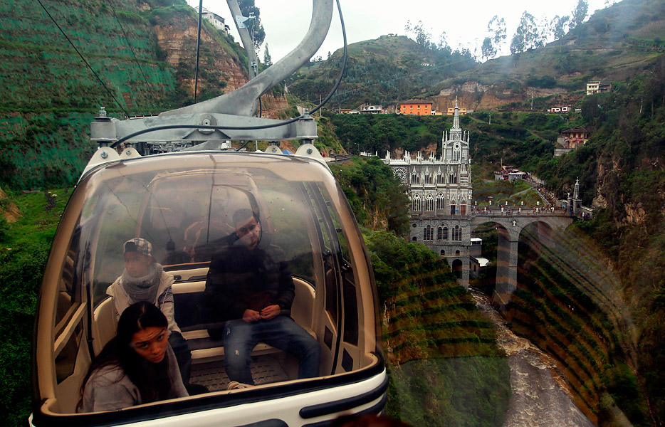 Visitors are transported by Cableway with the imposing Sanctuary of Las Lajas as background.