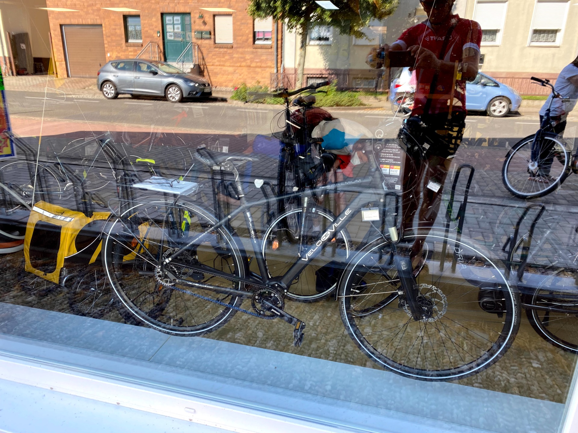 Couldn't just pass by this window without having a closer look at this Pinion transmission equipped touring bike. Haven't tried one yet but I've heard they are the best for touring. Also they come equipped with a carbon belt, so no chain or gears to clean and grease, silent, maintenance free elegant solution for touring, just don't forget to change the oil after each 10000 km, ok?