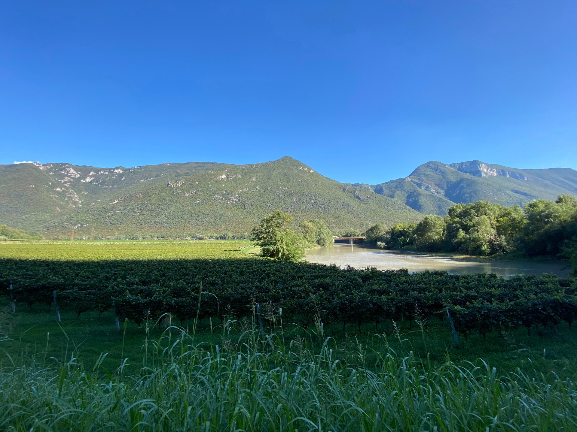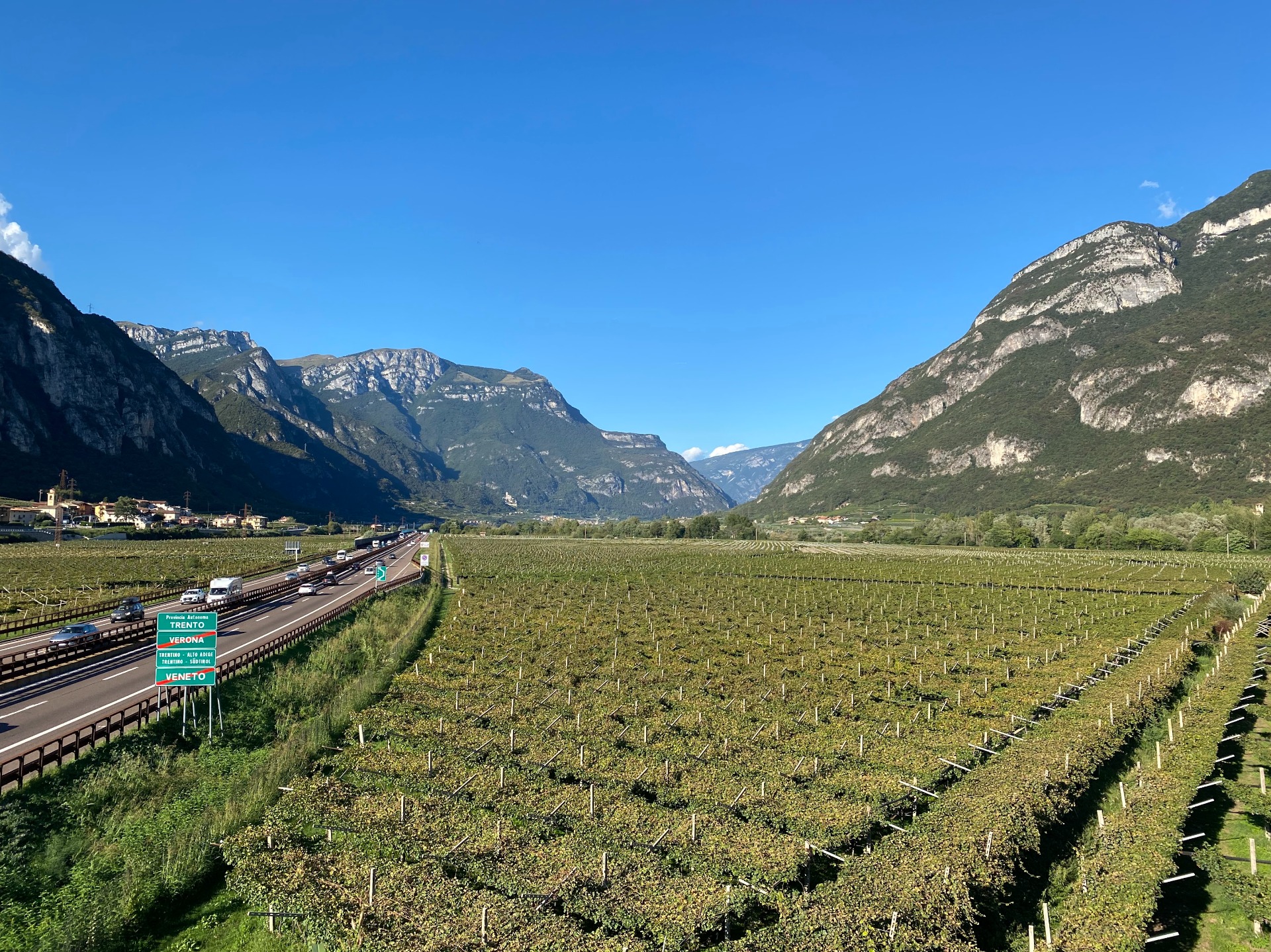 Agriculture plays an important role in the local economy here and all these vineyards right and left are well known for their quality of grapes. Trento DOC (Denominazione di origine controllata) is an appellation for white and rosésparkling wine made in Trentino, Italy. Trentinos developed this appellation, the second in the world after Champagne, to ensure quality and distinction. Only Chardonnay, Pinot noir, and Pinot Meunier with Pinot blanc are permitted, and they must be grown in a well-defined area within the Province of Trento. I should taste a glass later to confirm.