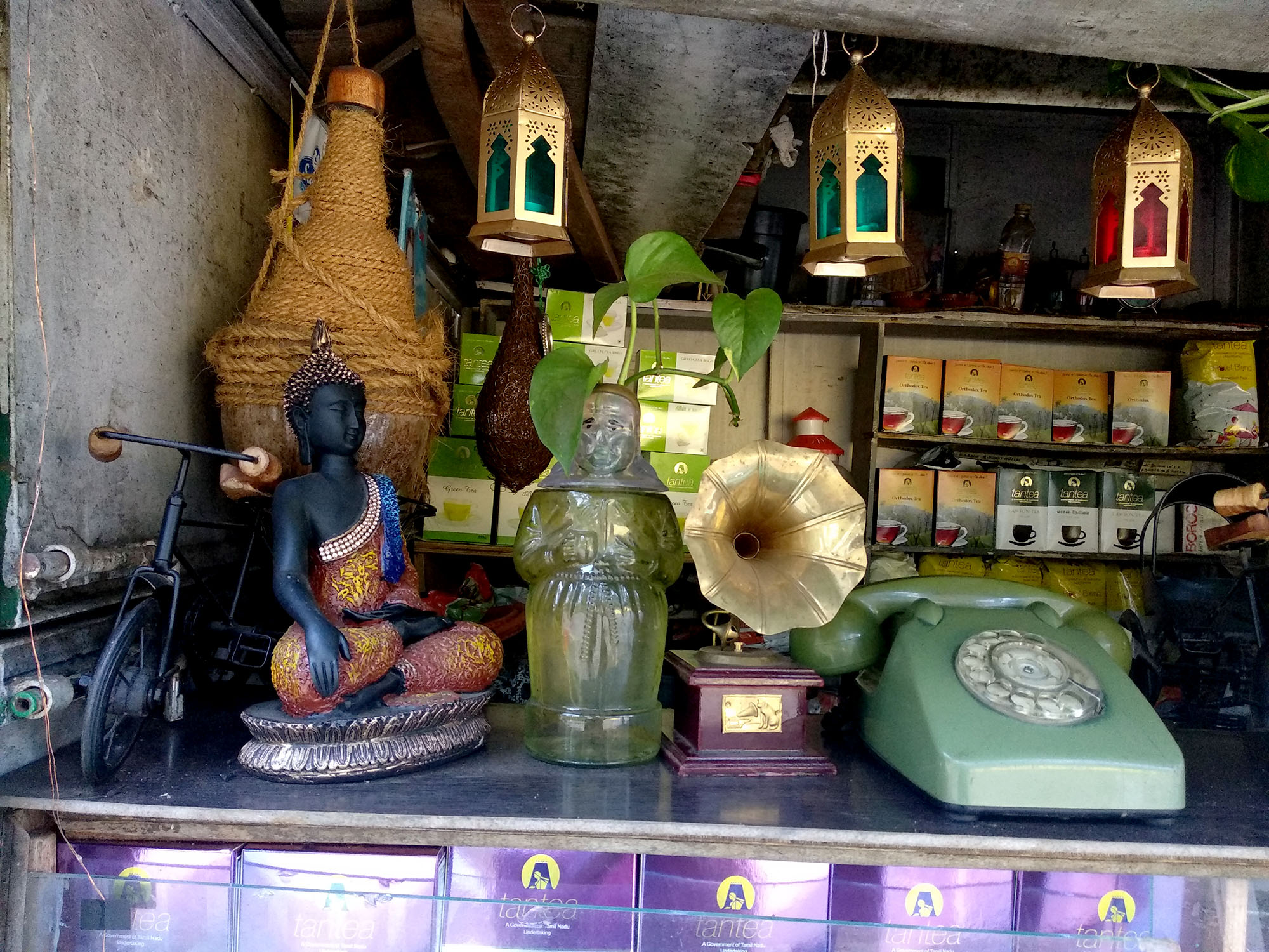 There are also these details about the shop that made us fall in love with the TANTEA tea stall. Its dark green painted metal frame, fairy lights in the evening, the golden tea pot that was hanging, the hanging nest, the old telephone and other little aesthetics and the list goes on.