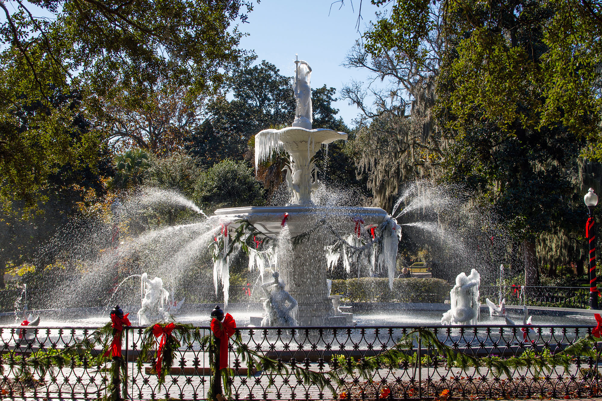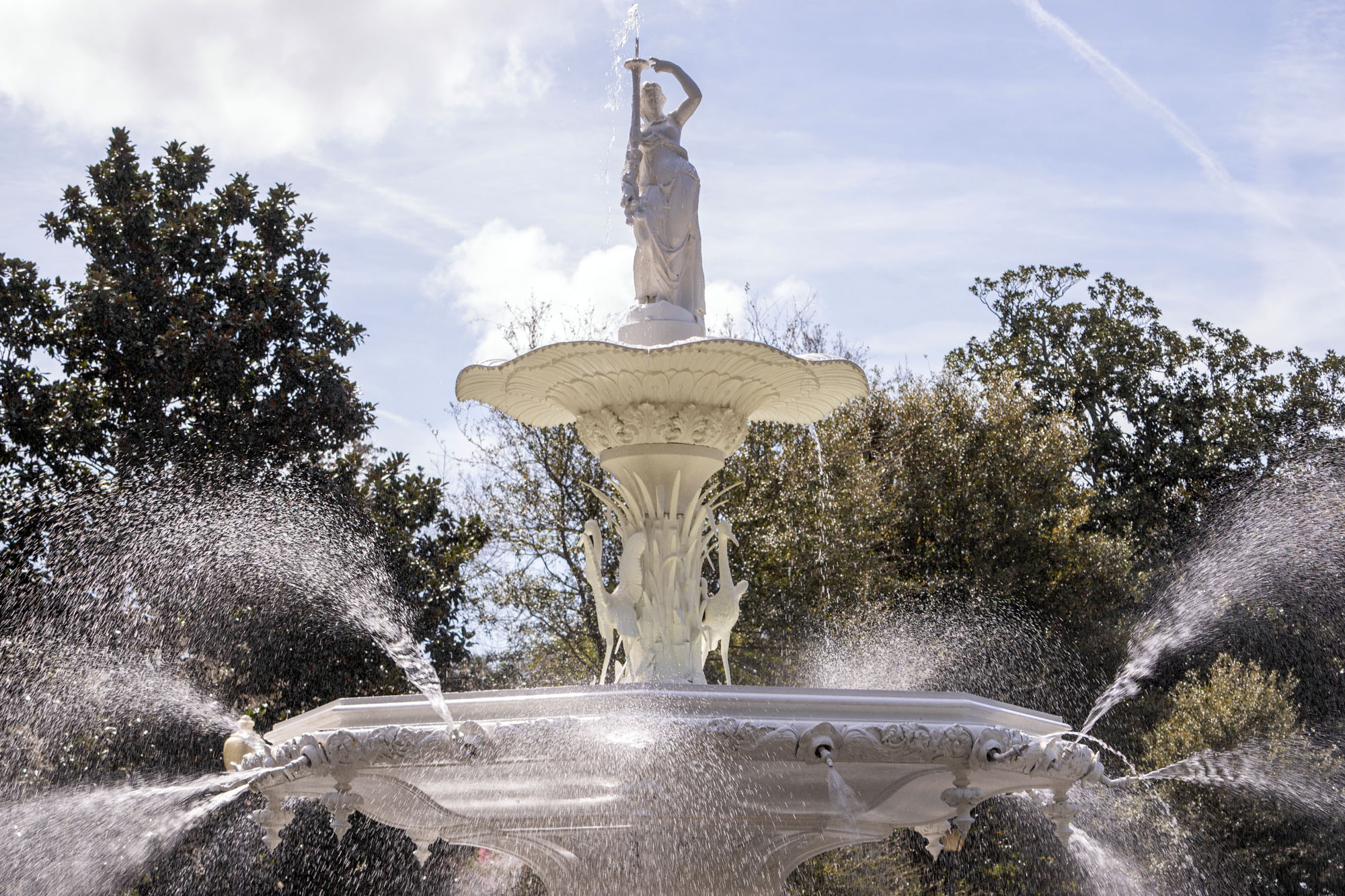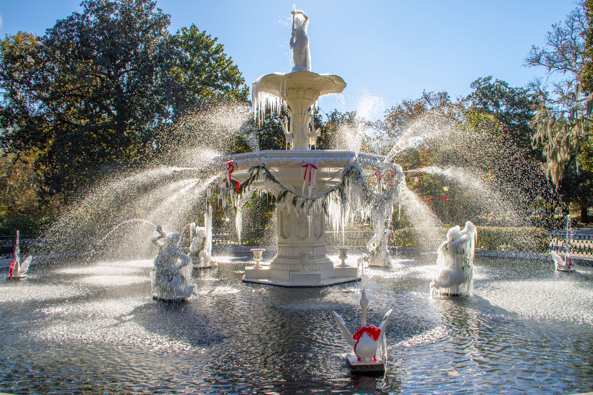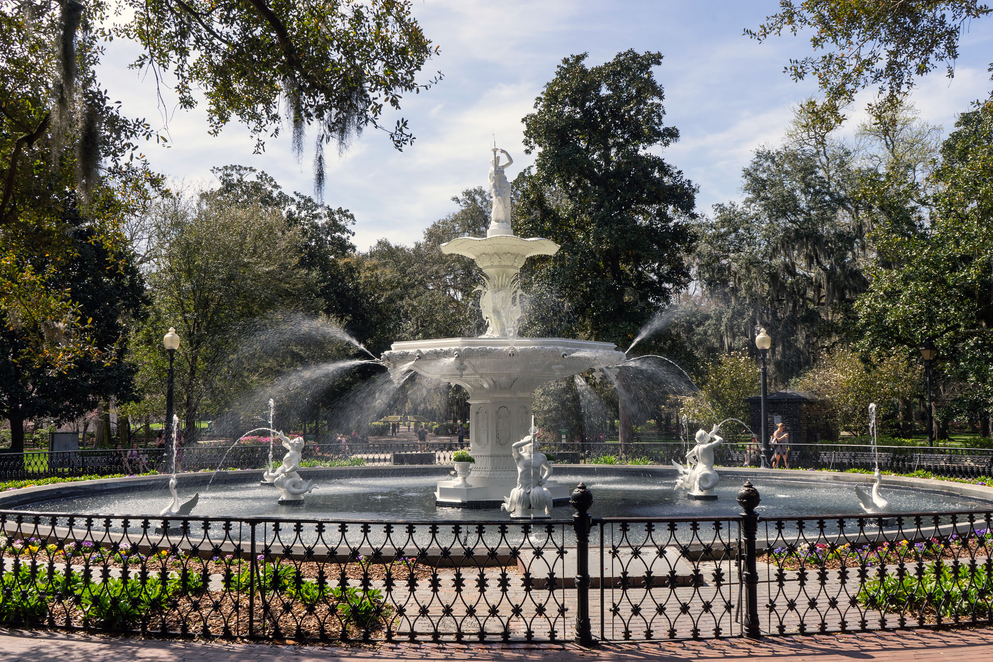 Forsyth Park was built in the 1840s and christened in honor of John Forsyth, a former statesman and Georgian governor. The park’s massive fountain, crowned with a female figure and flanked by spitting geese, was inspired by the fountain in Paris’ Plaza de la Concorde. With water shooting haphazardly in all directions, it’s one of the most recognizable landmarks of Savannah, appearing in films like 1962’s Cape Fear and Midnight in the Garden of Good and Evil.