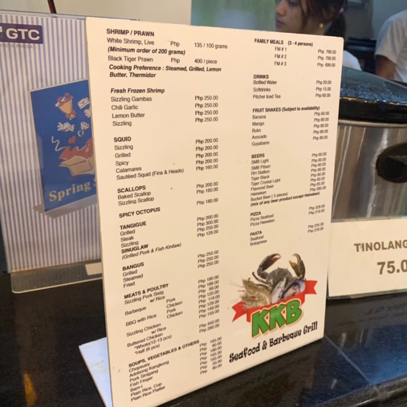 Representative menus: garlic shrimp, black pepper shrimp, grilled fish