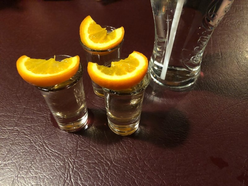 Tequila and water!I ordered a lemon instead of orangetequila, one shot andjust eat an orange that ...otherwise so bitter tequilafeel thirsty ride.