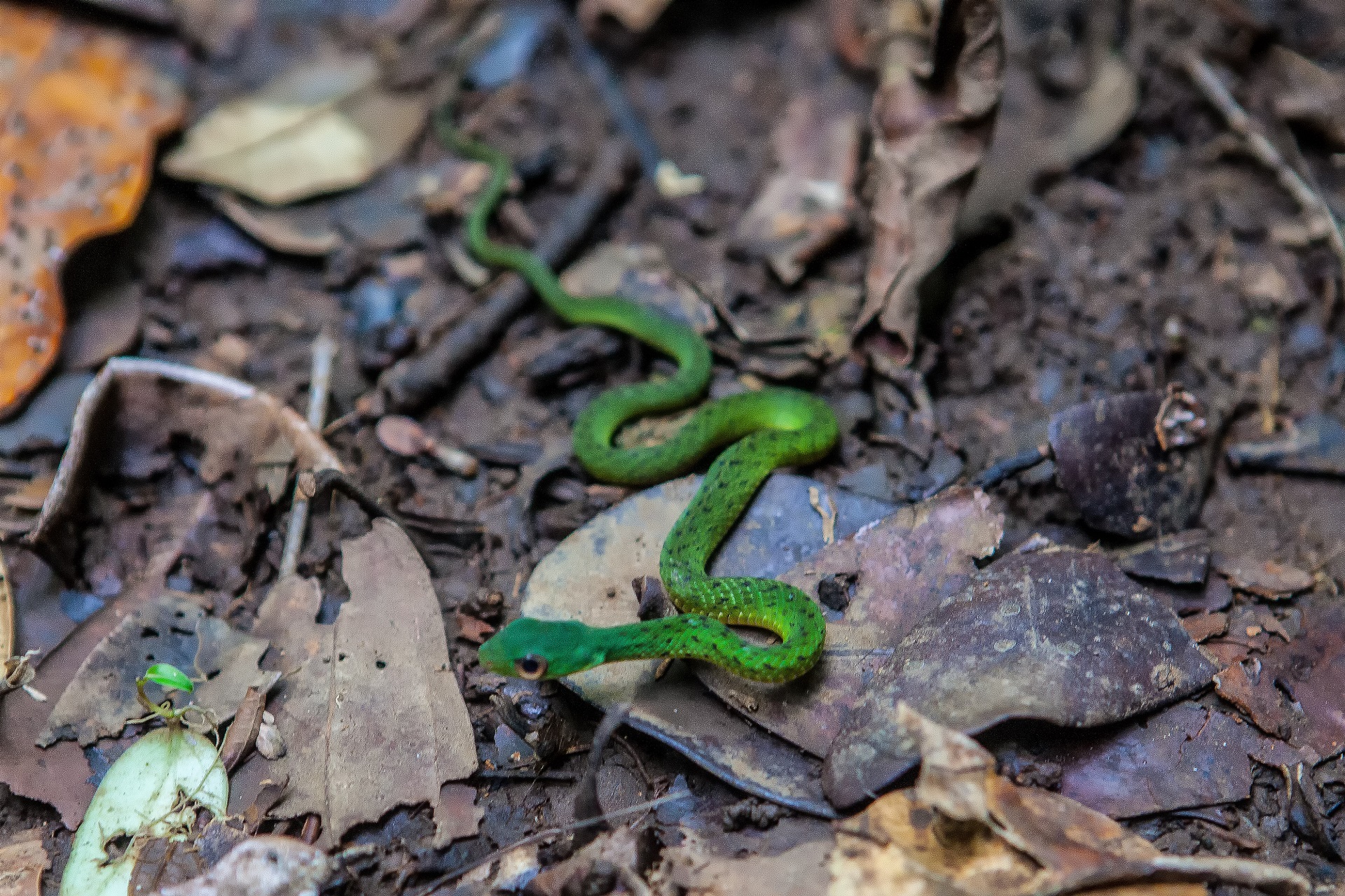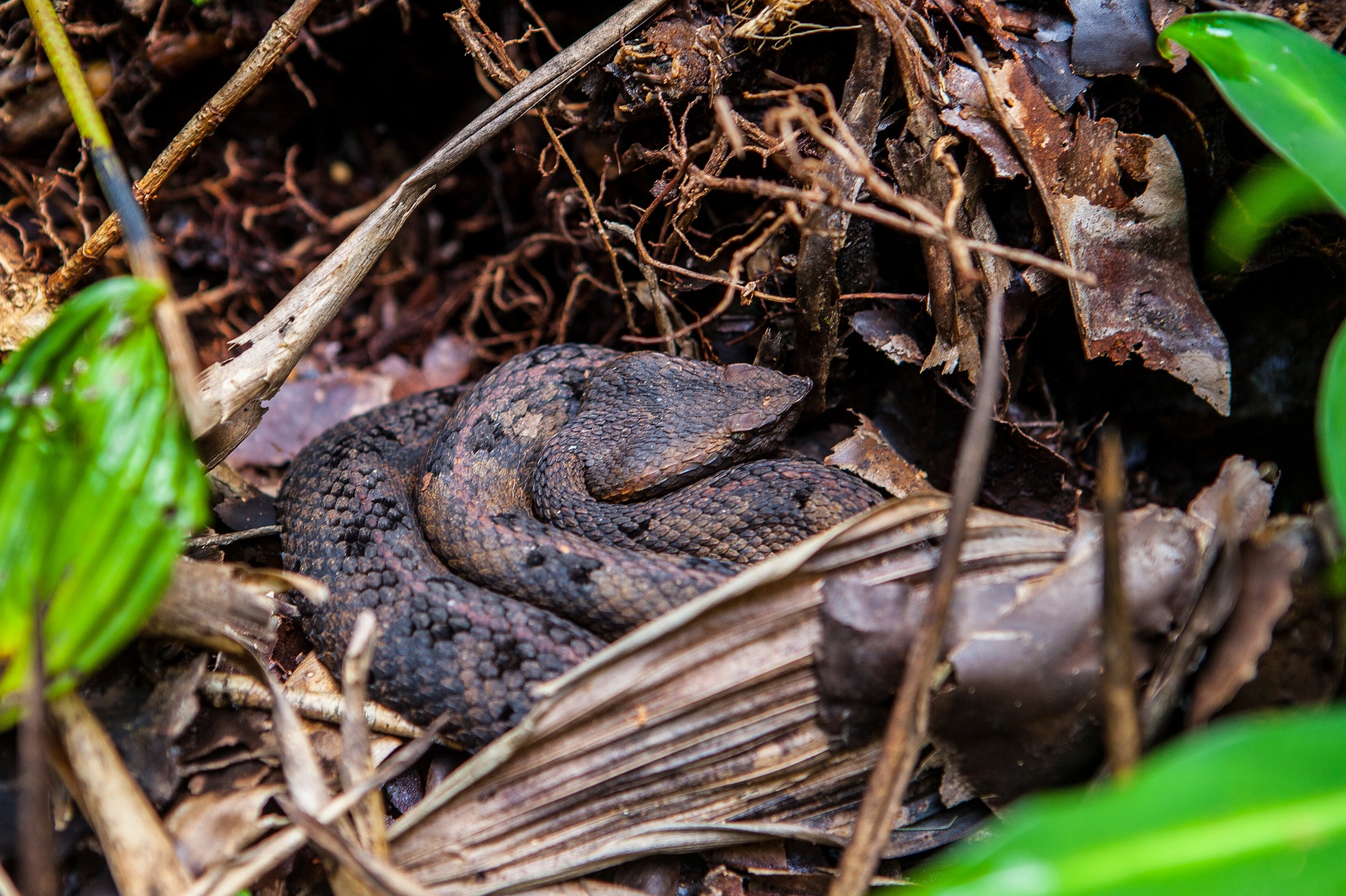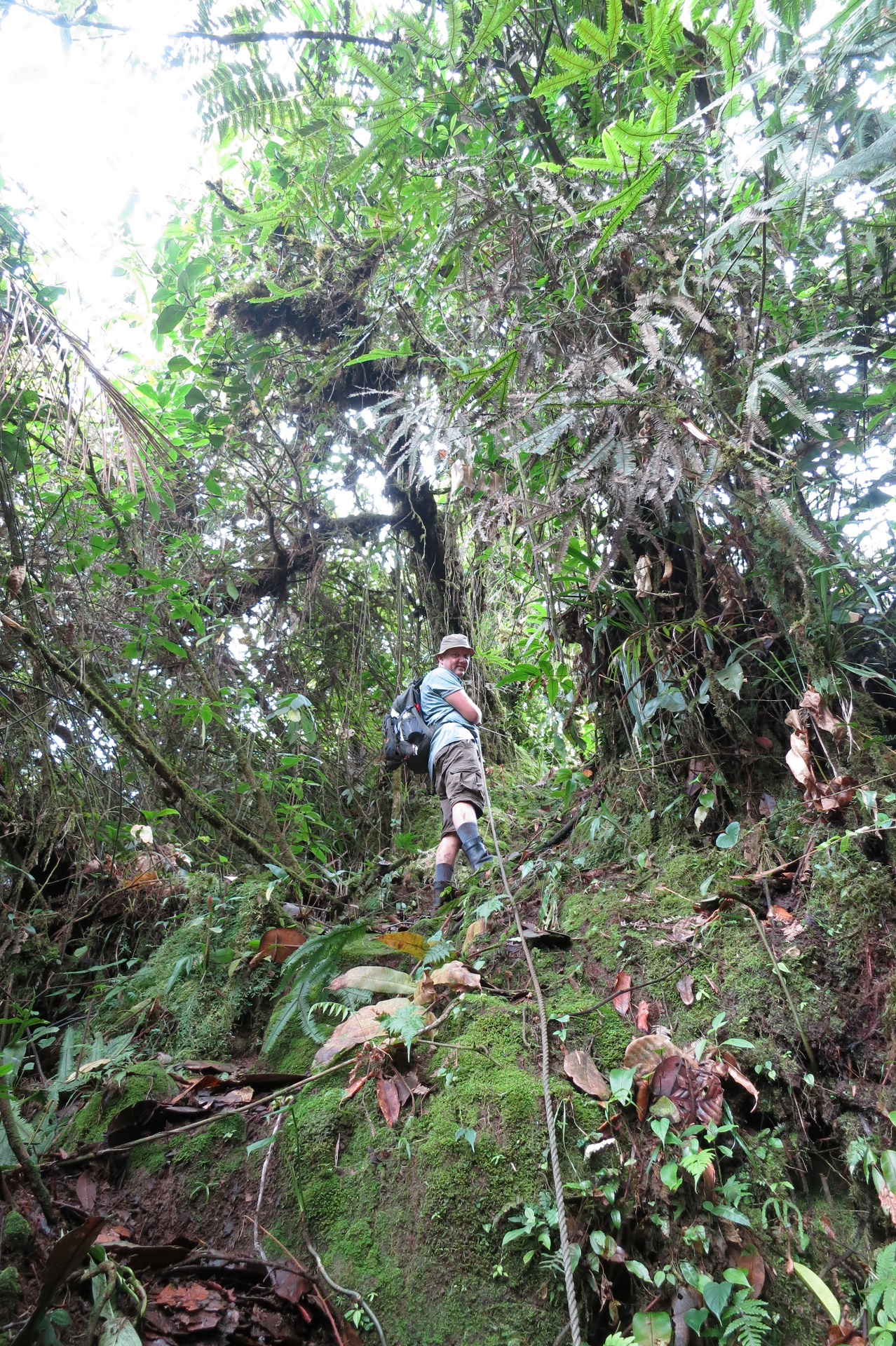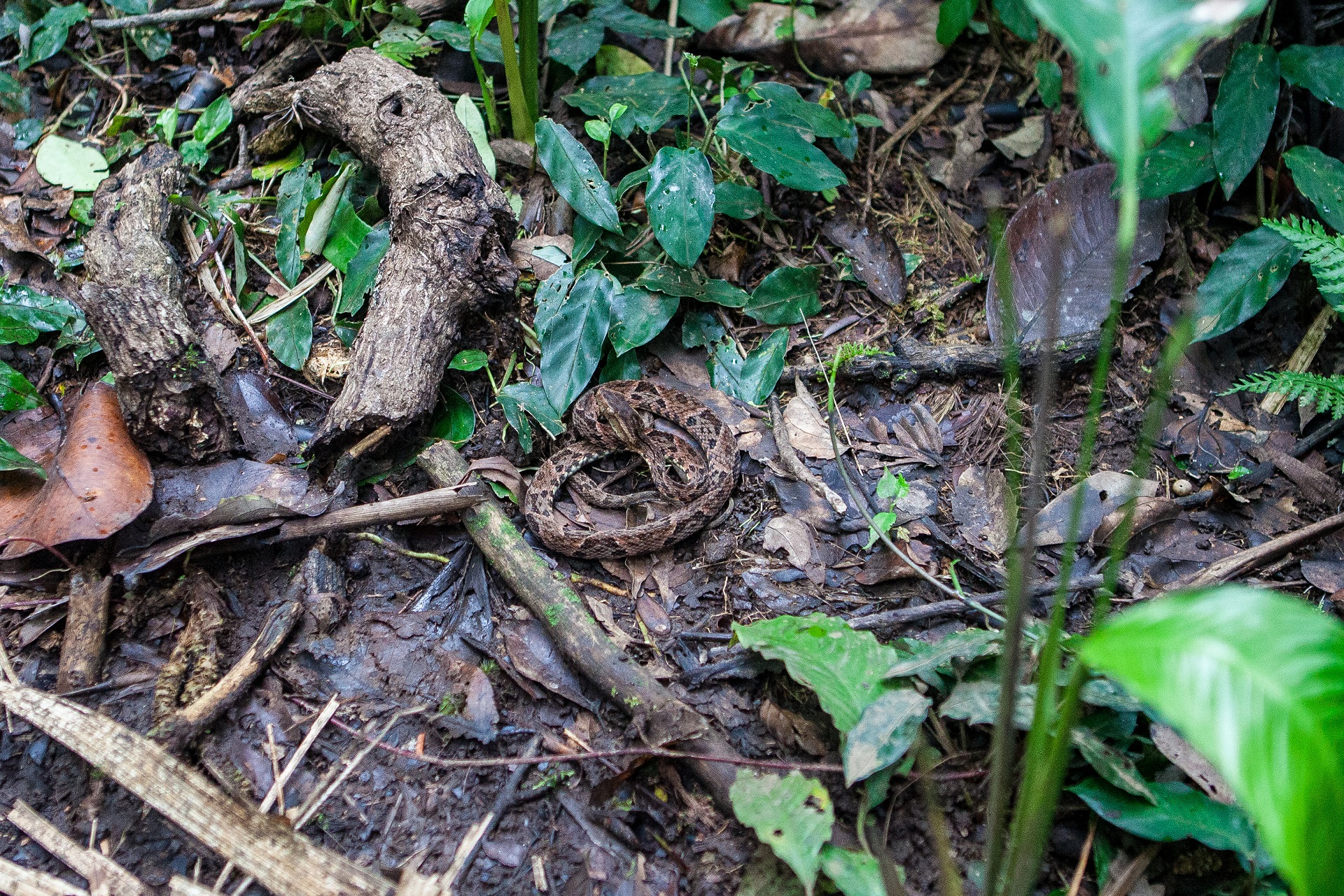The next morning we took a hike to a big waterfall. It was a round trip of 8 hours so we took off early! This trip was over a path that was so overgrown it took as more than that. The pat ran over a mountain ridge and was very narrow. In some places no more than 20 cm wide. At one point there was a tree on the pat that we had to climb around, but there was a hog nose viper sleeping on the other side of that tree! we even came across a Fer-de-lance lying in the middle of the trail. Then I realized that we had been on the road for 3 hours and that the helicopter site was now more than 5 hours away from where we where! A sweet reminder to take good care! The first stop was a little waterfall where we took a little swim to cool down and to eat breakfast, not long after that we saw the big waterfall for the first time and that gave us a nice boost to hike faster. The last part to the waterfall was very dangerous. Basically we just walked over fallen trees and branches. We didn't feel the ground again until we reached the rope where we could climb down.