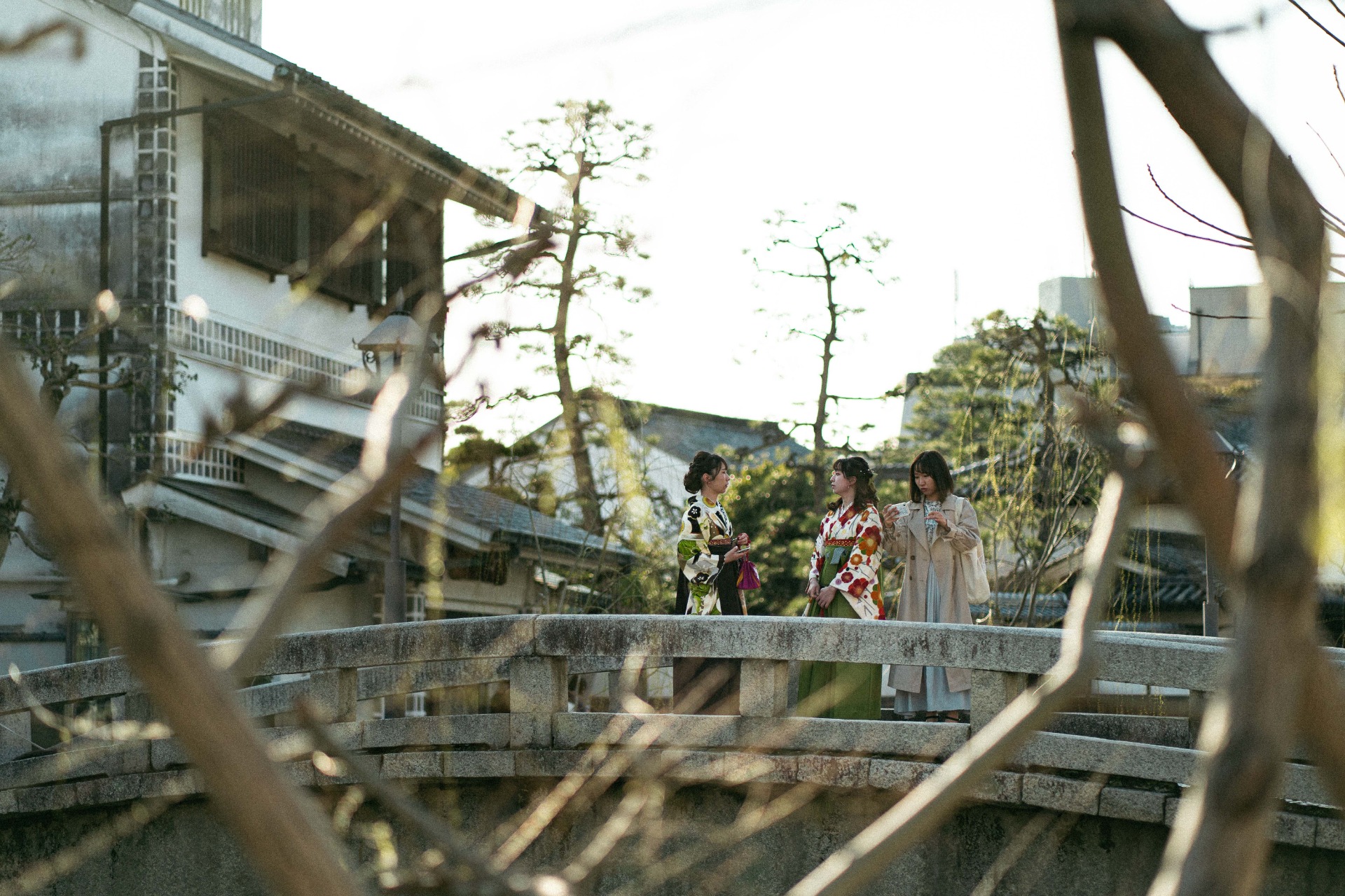 The first thing we saw in Kurashiki was a long pedestrian bridge leading to a huge sign advertising a pachinko parlor. The second was a karaoke booth. Based on the surroundings of its train station, Kurashiki didn’t look much different from any other city in Japan. Yet, we knew there was something special about this town south of Okayama and it didn’t take us long to find out what exactly. In truth, all it took was to follow a group of girls wearing traditional kimono with a colorful flowery pattern as chances were high we were going to the same place.