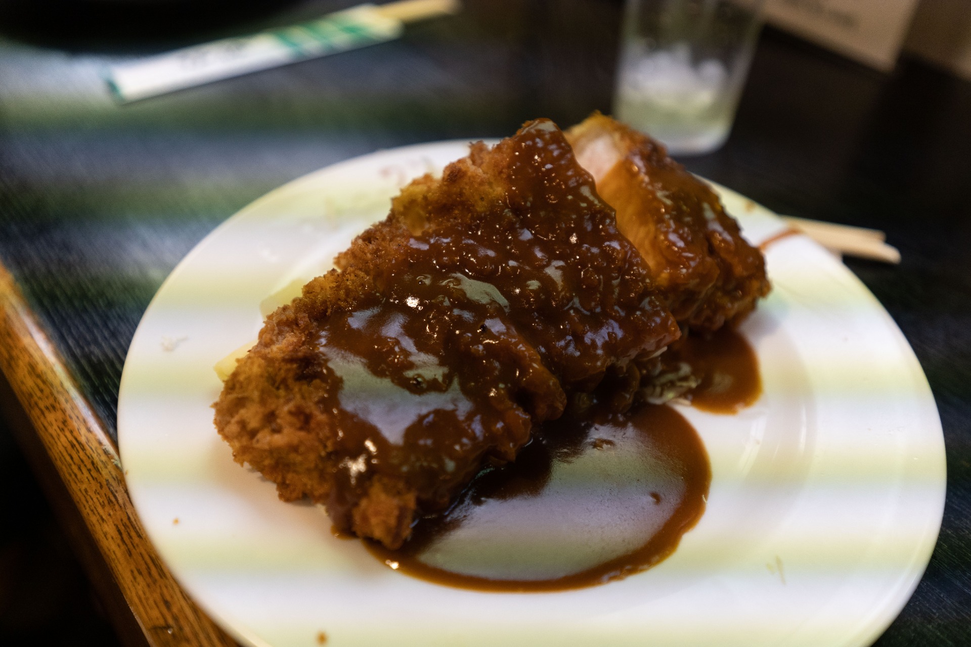 and we decided to get a quick bite before nightfall. Kurashiki was known for a specialty called demikatsu and the sound of fried pork cutlet topped with demi-glace sauce sounded appealing enough to walk to the other side of the district to the Kappa restaurant, aka the best demikatsu in town according to the Internet. Locals seemed to agree and we had to wait in line for fifteen minutes. A waiter had come to take our order as soon as we had arrived though and we were munching on a juicy piece of thickly sliced pork at the counter in no time.
