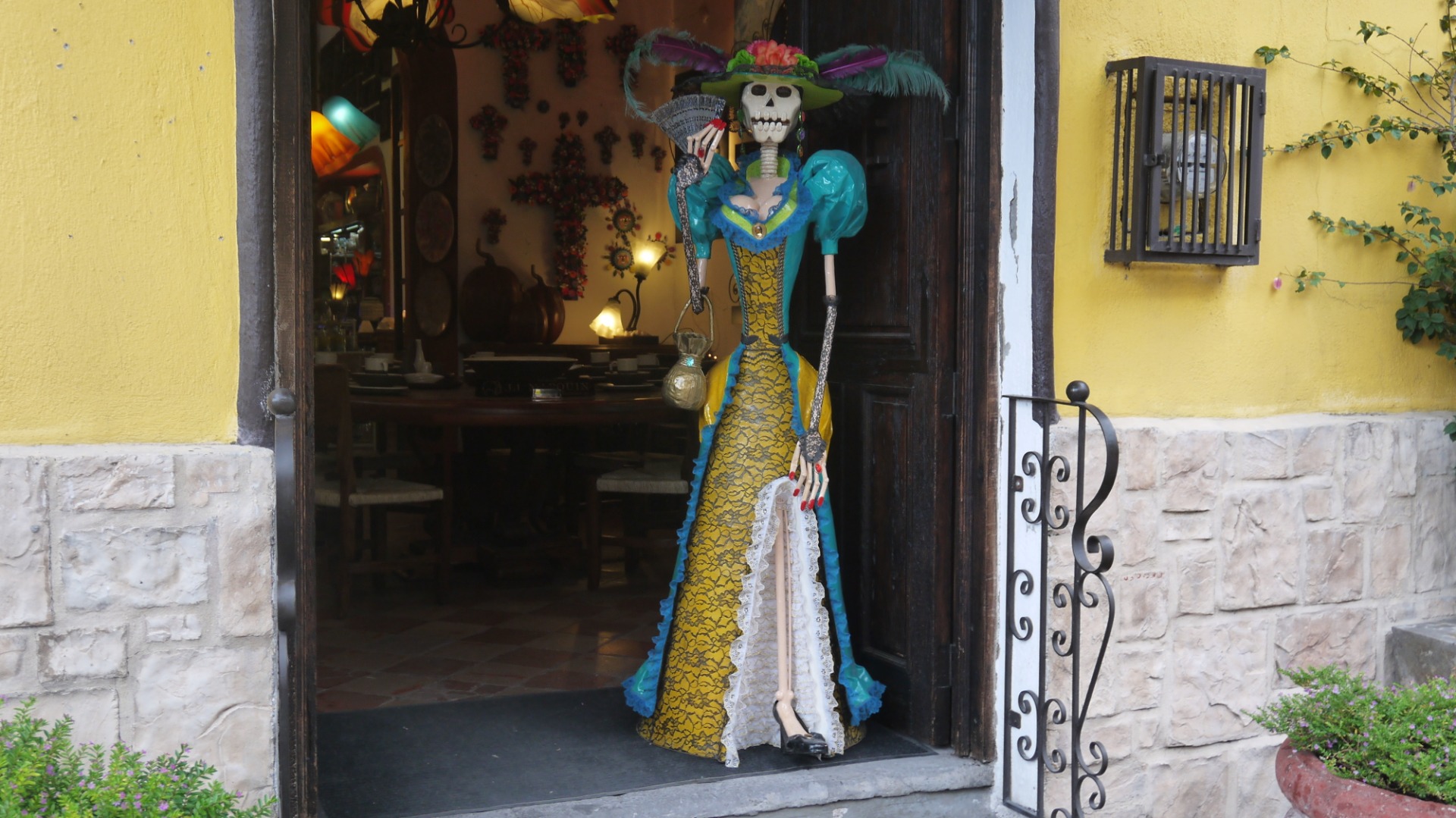 Tlaquepaque seemed to be a shopping destination of choice for locals and tourists alike and we then took a walk in its colorful alleys, welcomed by the sight of a very fancily dressed Catrina skeleton on the threshold of a couple stores.