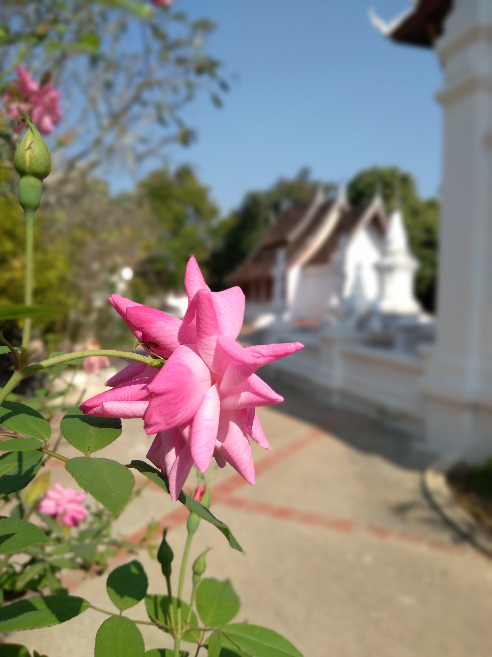 I captured this shot at sunset at Xiengthong Temple which was built in the 1500s. I imagine that way back then there were fewer distractions so they maintained the flowers and buildings even better than they do today.