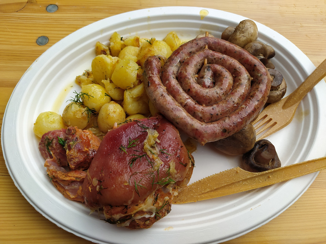 I went for Golonka, Kielbasa and Pieczarki! What are they? Golonka is pork neck, stewed in cabbage. Kielbasa are sausages and Pieczarki are roasted mushrooms. Of course I added roasted potatoes too.