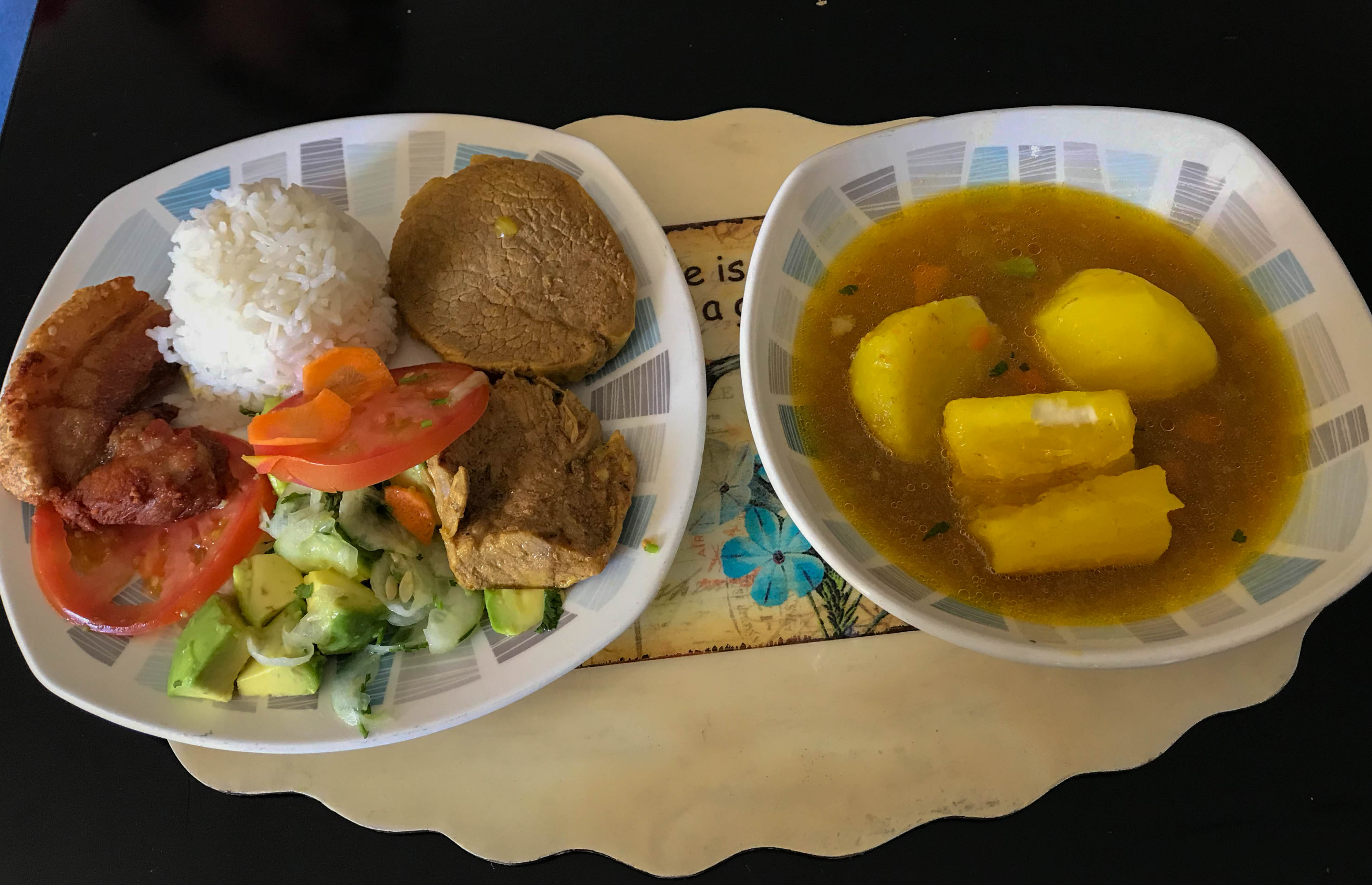 The first bowl contained a very filling soup with 4 large yucas (a kind of potato) in it, while the second plate contained TWO steaks, rice, tajada (fried banana), chicharron (pork) and an avocado salad. This is a BIG meal!