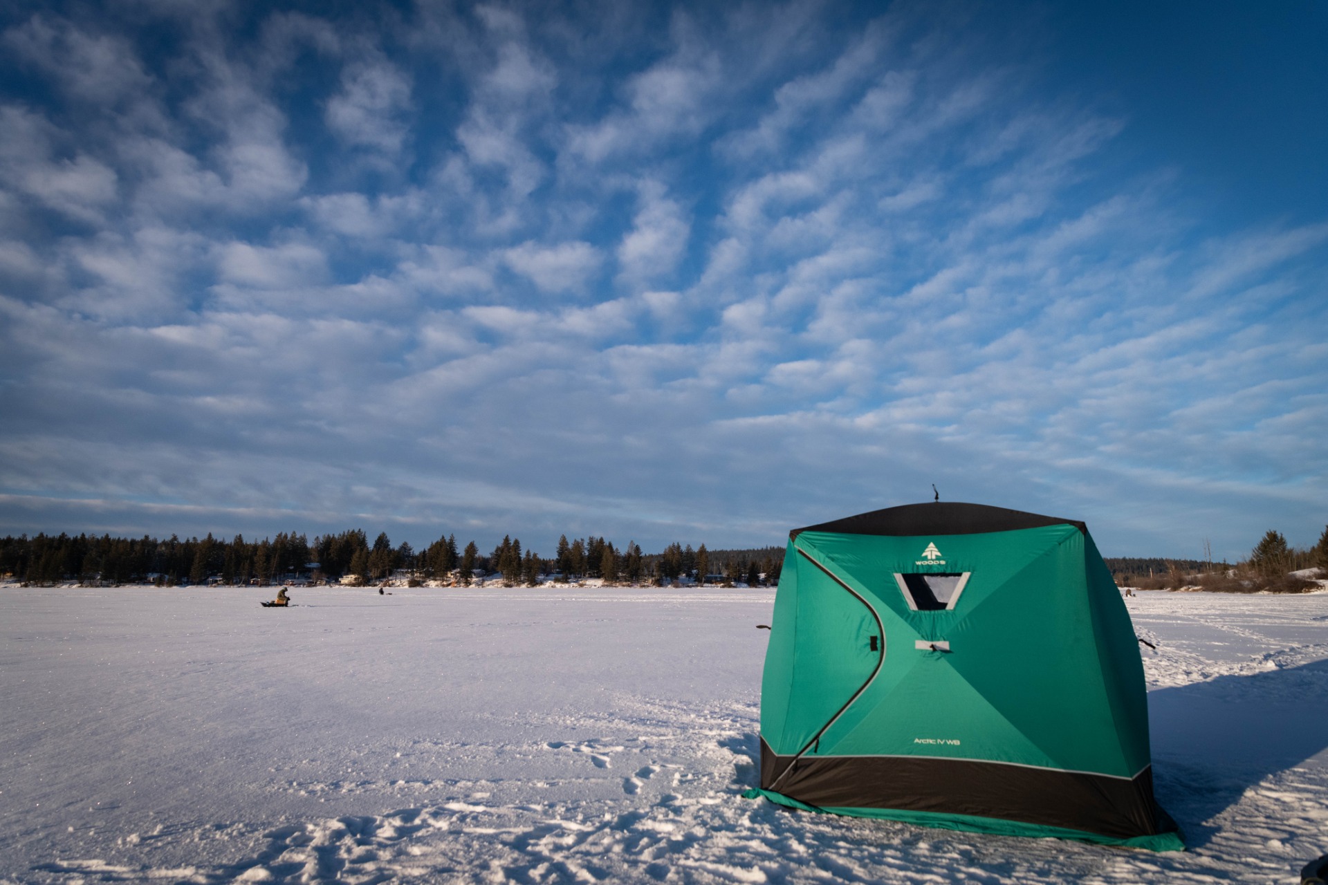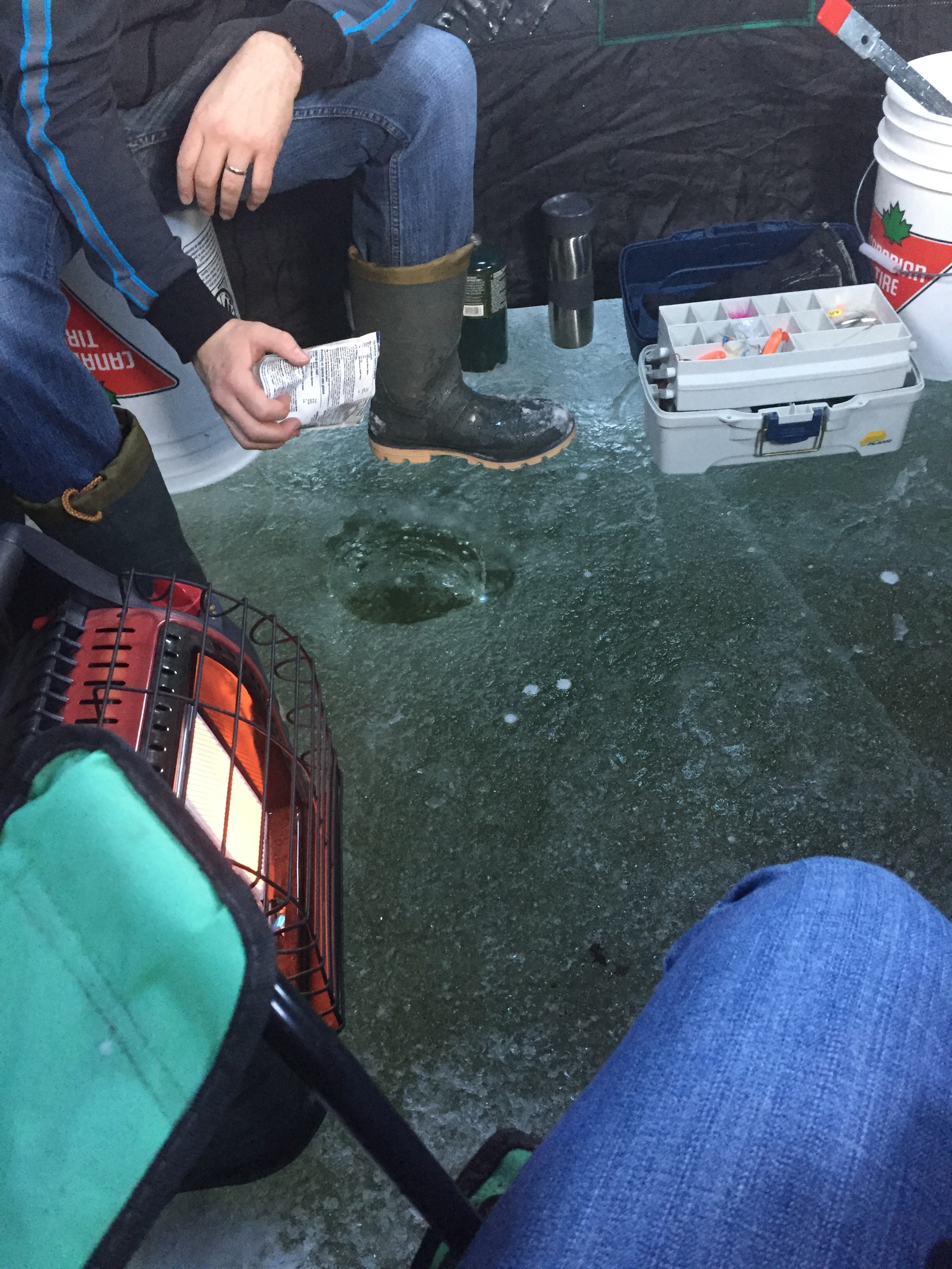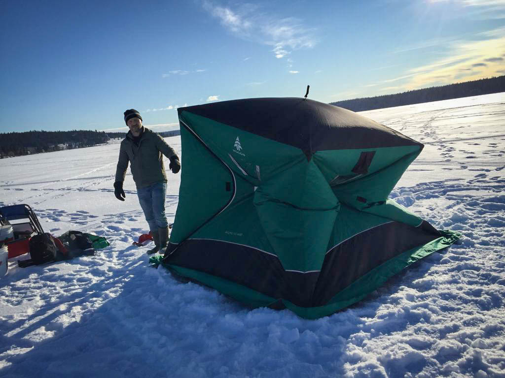 For those who have never gone ice fishing, you want to clear the snow on the area where you will place the tent so that you have a clean area to work on. There's also a heater in the tent and it can get quite warm in there, so you don't want a slushy mess of melting snow in there. In fact, it can get so toasty in there that you can be quite comfortable just wearing a t-shirt.