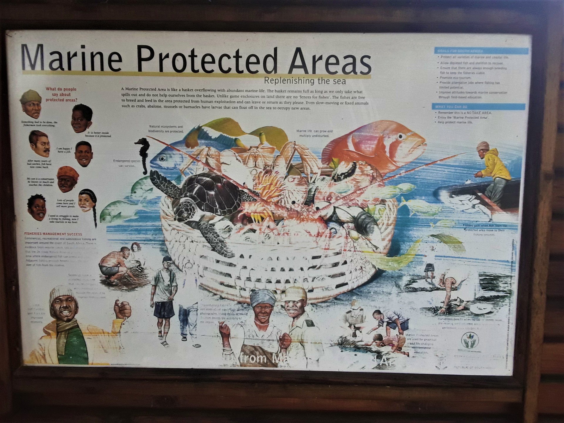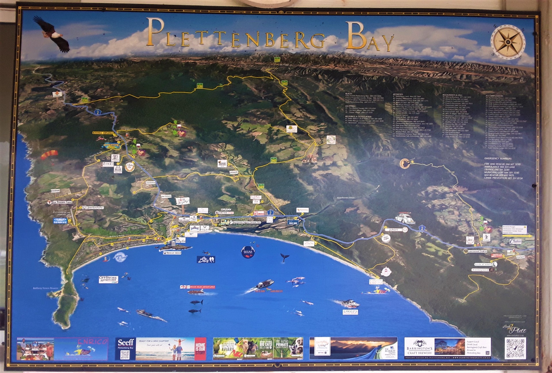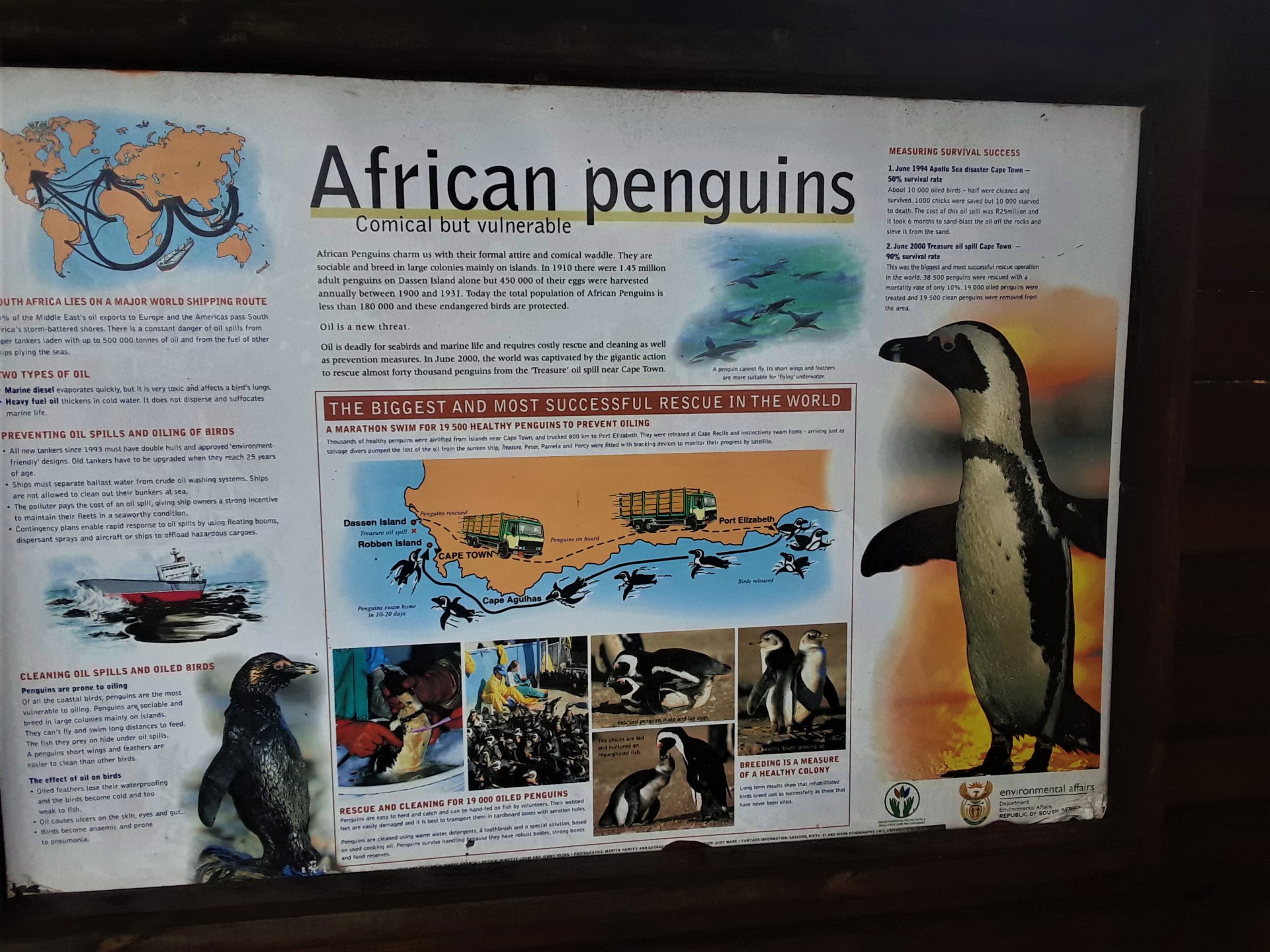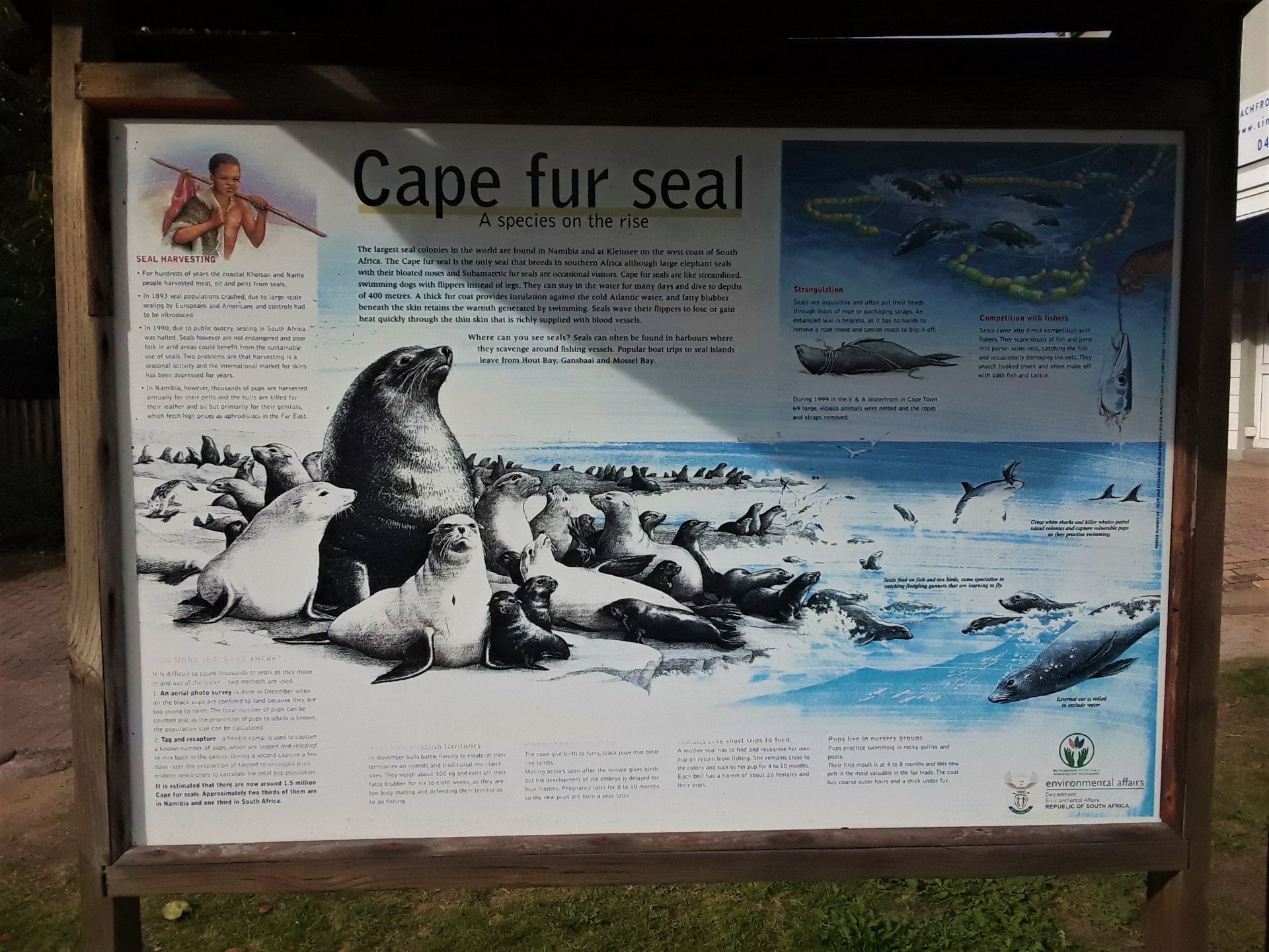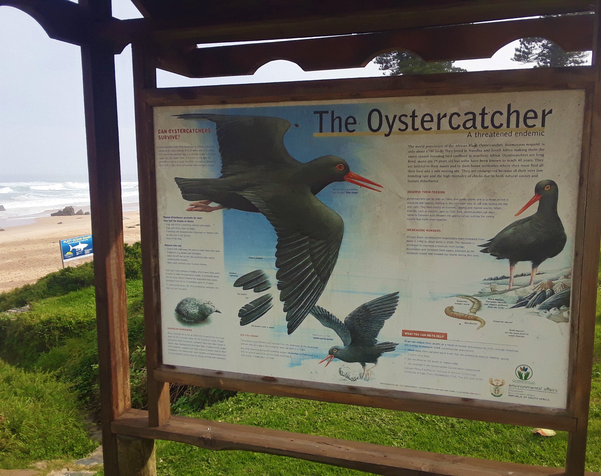 If you want to learn about marine ecology and see the most majestic mammals on earth, the giants of the world, then the Garden Route region of these southern African shores is just the place for you. As you can see in the notice boards dotted along the shoreline here, plenty of information is available and the region is a haven and sanctuary for all the sea birds that nest here as well as the seals and porpoises. It is such an awesome sight to see them jumping out of the water, and to see the line of them stretch for what seems like miles along the shoreline.