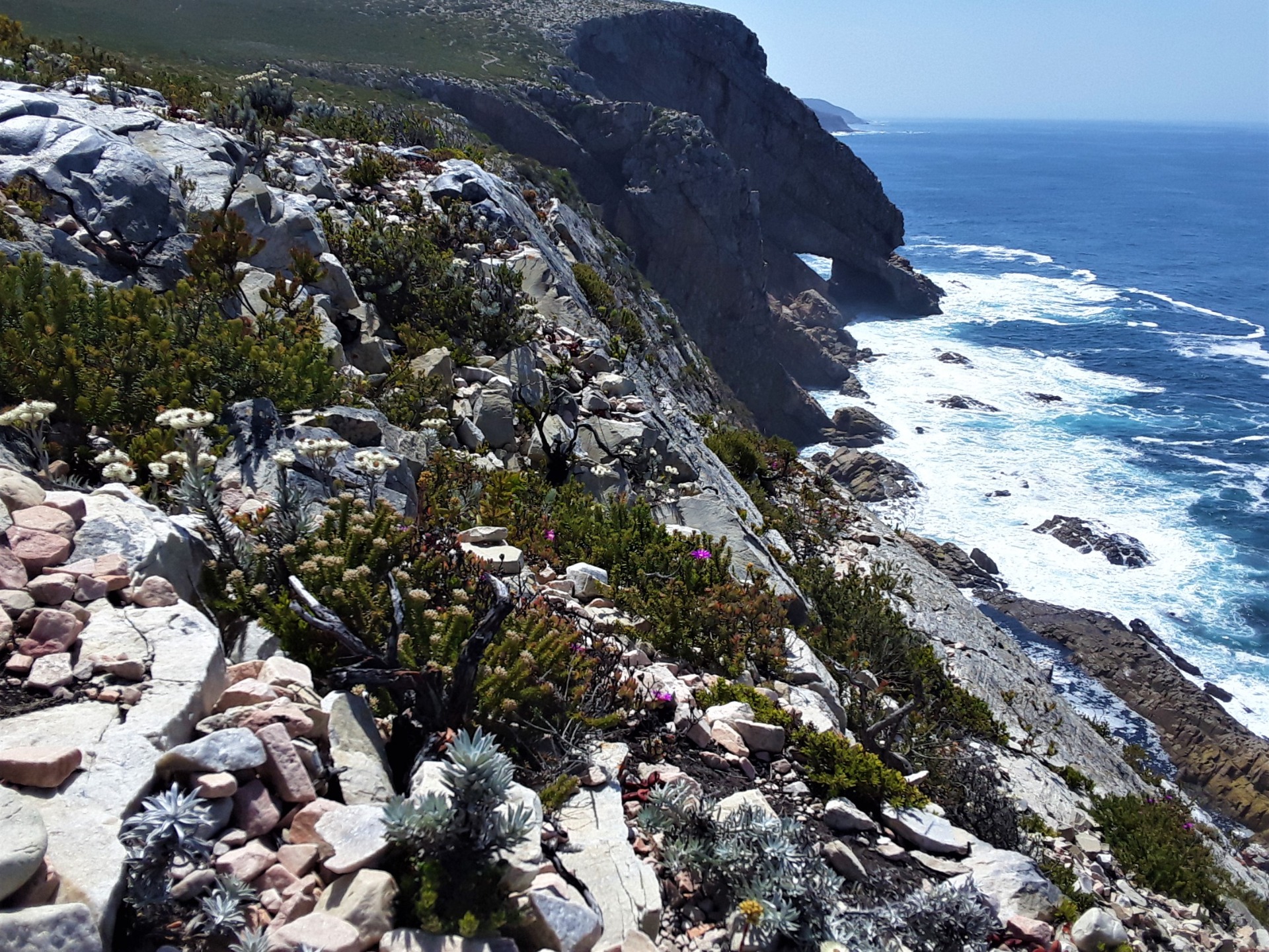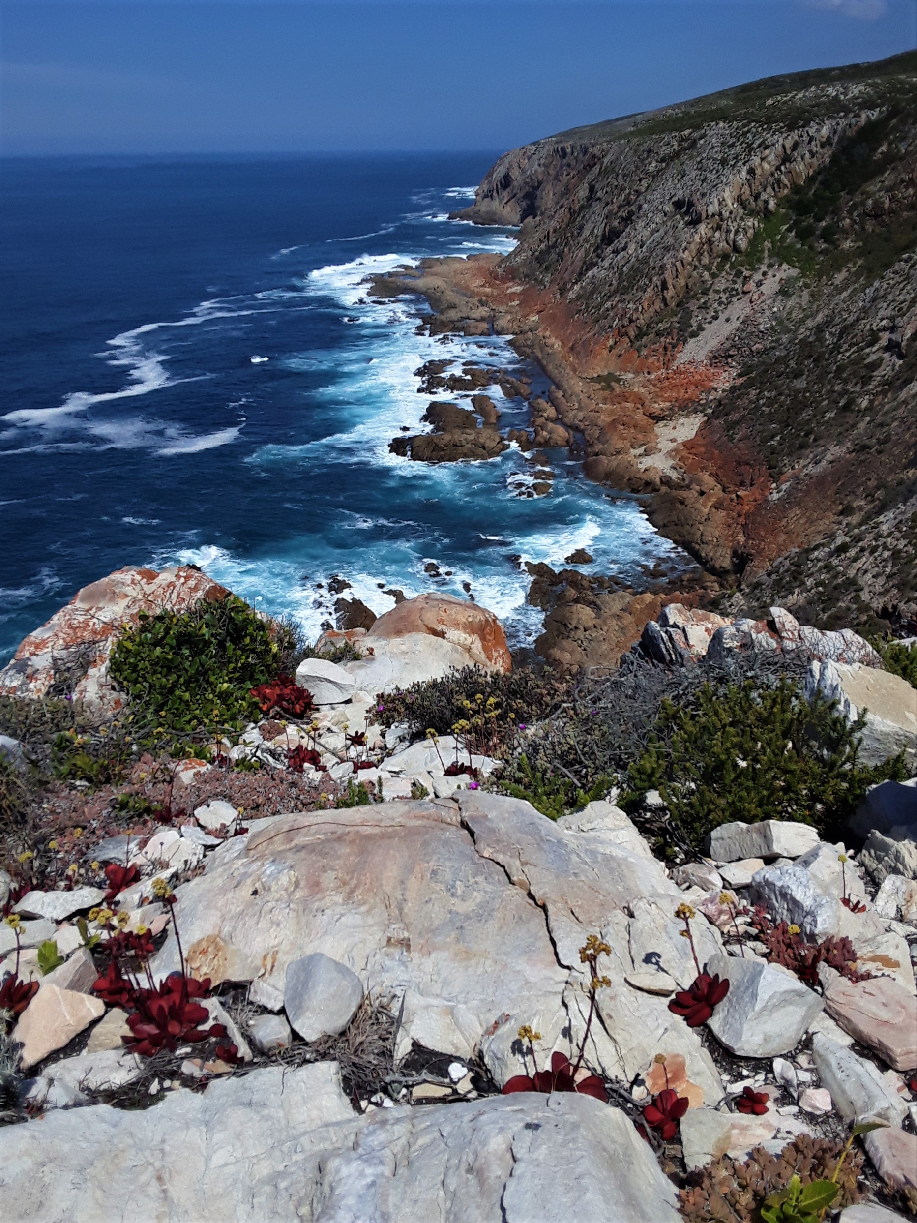 A view from the cliff top with fascinating red indigenous succulents in the foreground, facing west.