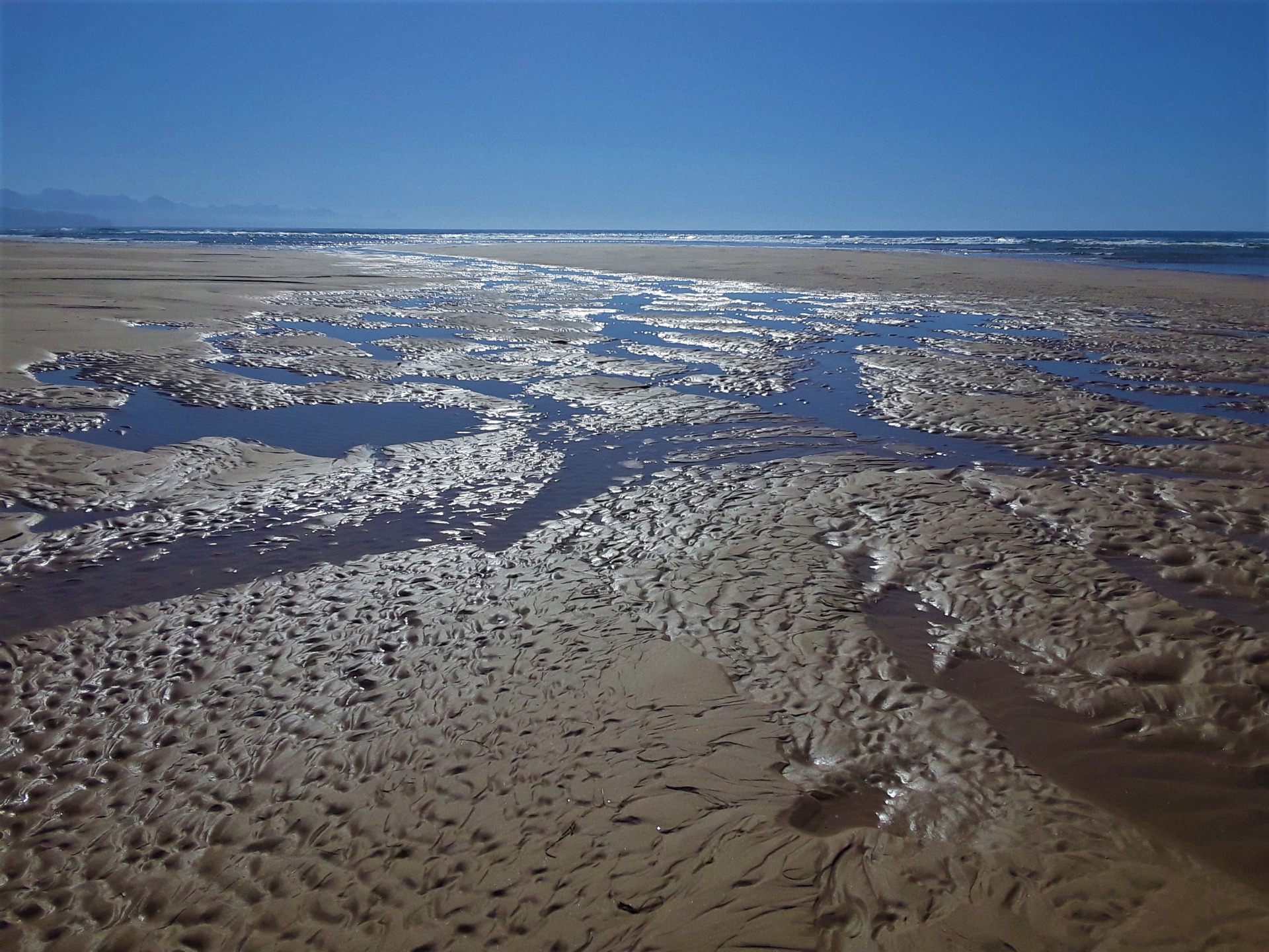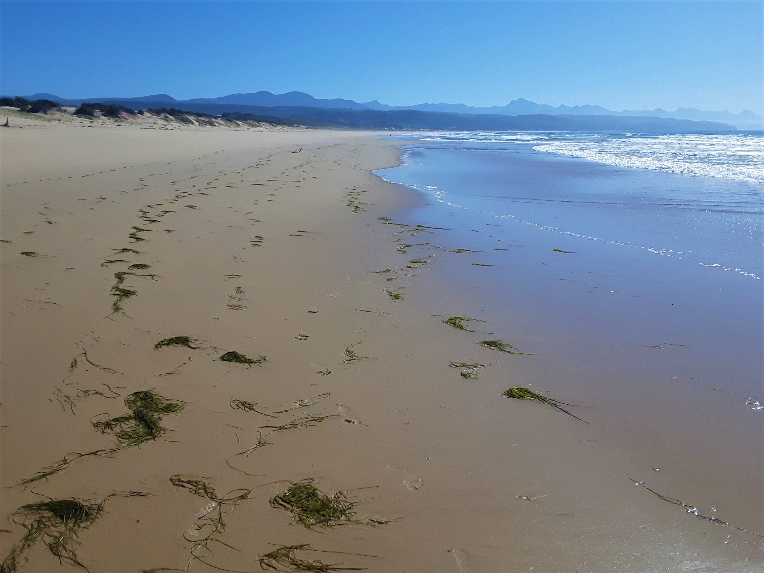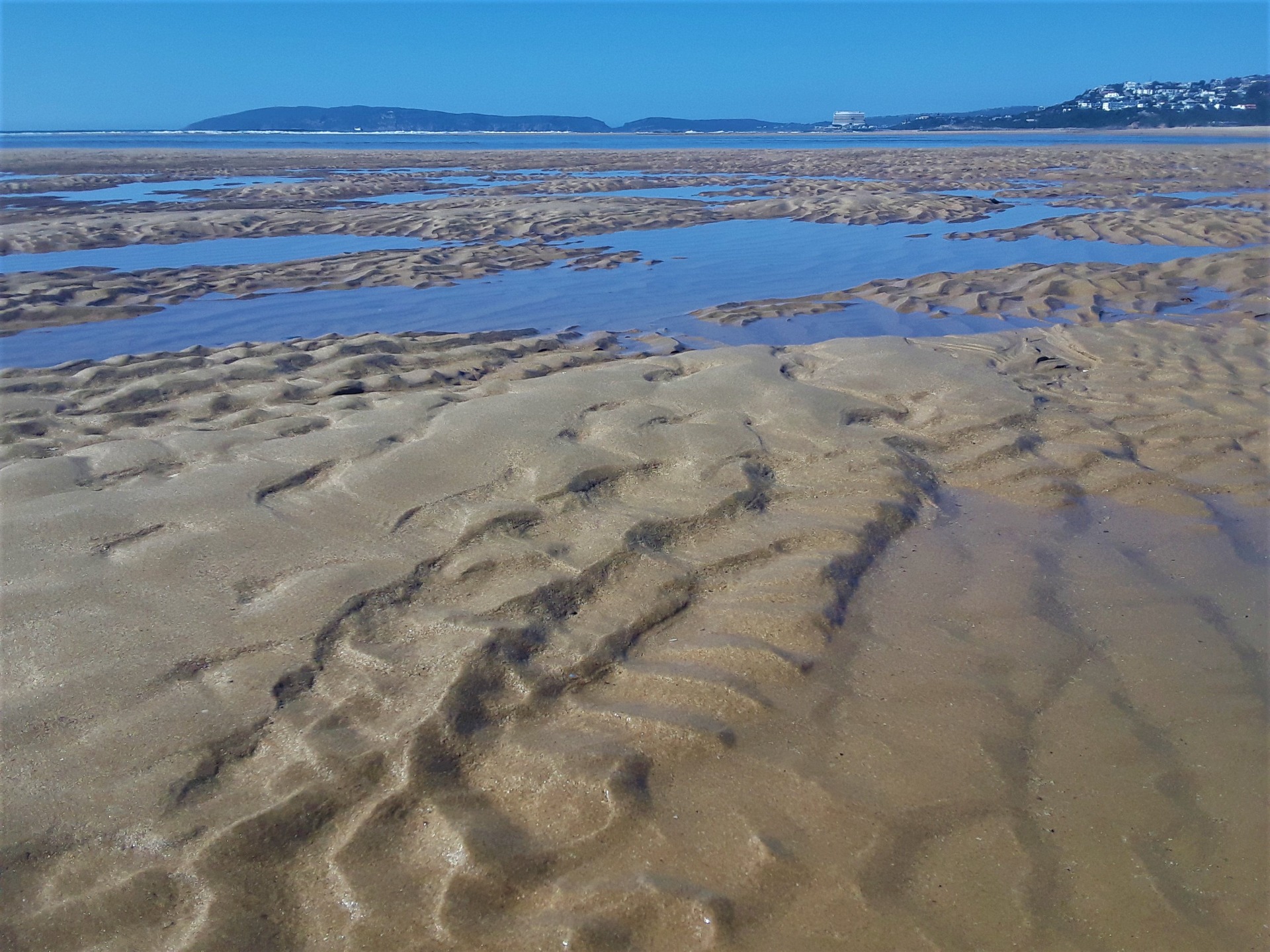 Today the tide was really low, so it made some fascinating reflective patterns in the puddles left by the lingering sea water. The ripples on the sand that would normally be covered by ocean looked quite curious with their undulating patterns. You can see that the tide had been rough and somewhat stormy prior to my arrival. The washed-up fresh green river grass is a clear indication that the current was strong and the water quite rough, to wash so much river grass out of the mouth of the lagoon and out to sea, where it then gets washed up on the pristine white sandy beaches.