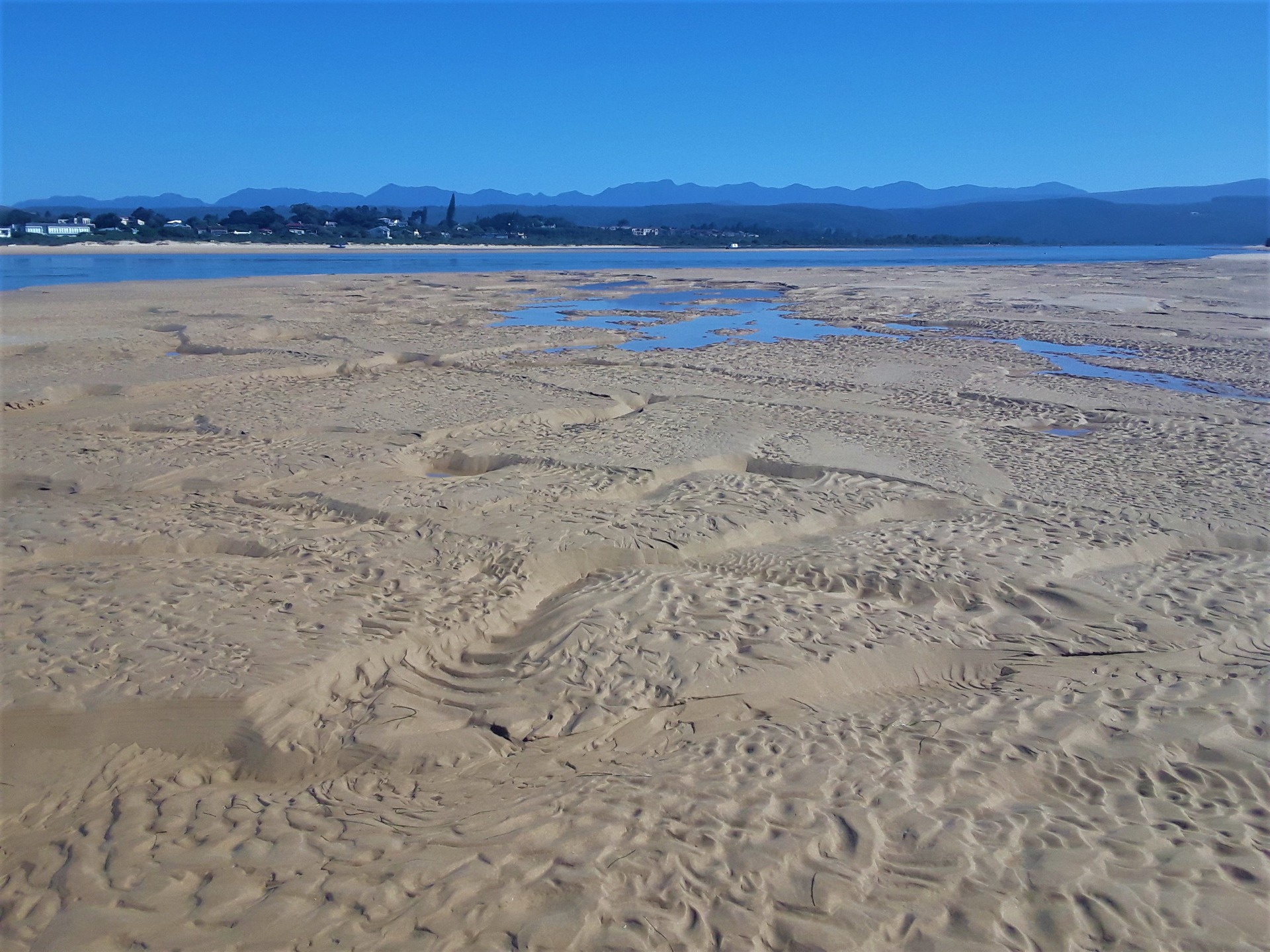 This little river mouth flows downstream and into the lagoon at the tourist town of Plettenberg Bay. From the lagoon, the water then eventually flows out to sea via the mouth. Being right next to the ocean, this lagoon is affected by the tides. When it’s high, the sea washes upstream and at low tide the fresh water flows out to sea quite prolifically.