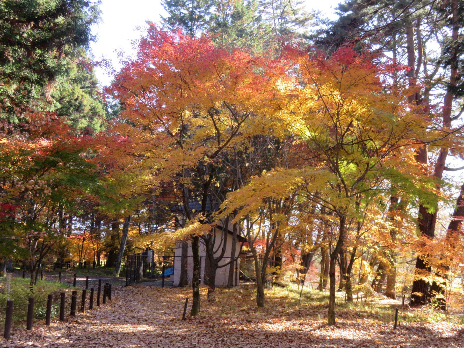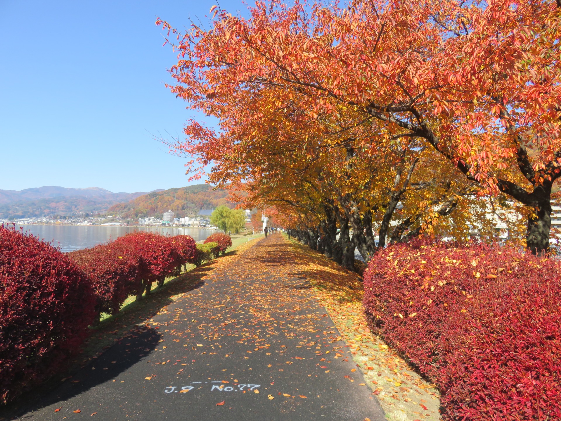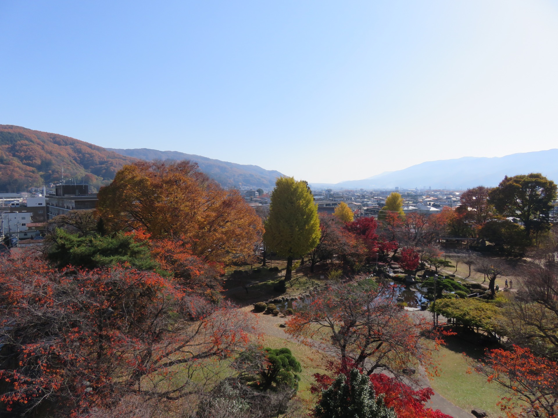 Just before the mountains closed in again around us on our way up to Matsumoto, we stopped at one more park, Izuhaya park, on the outskirts of Suwa. The colours here were vivid and the autumn sun was a deep yellow. The leaves were blowing slightly in the breeze and someof them were falling to the ground to join many others.