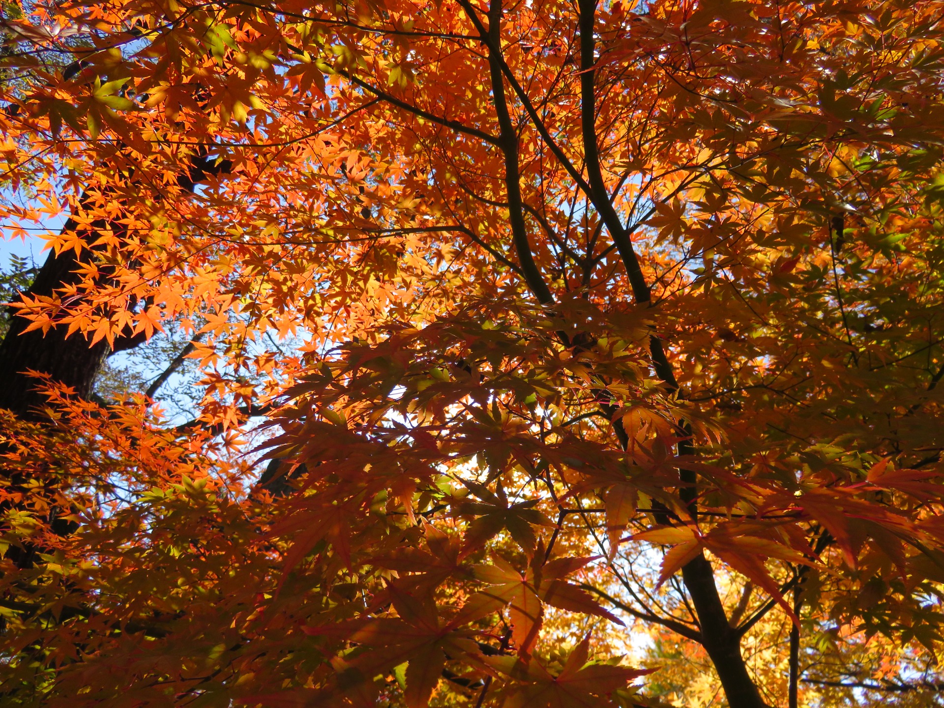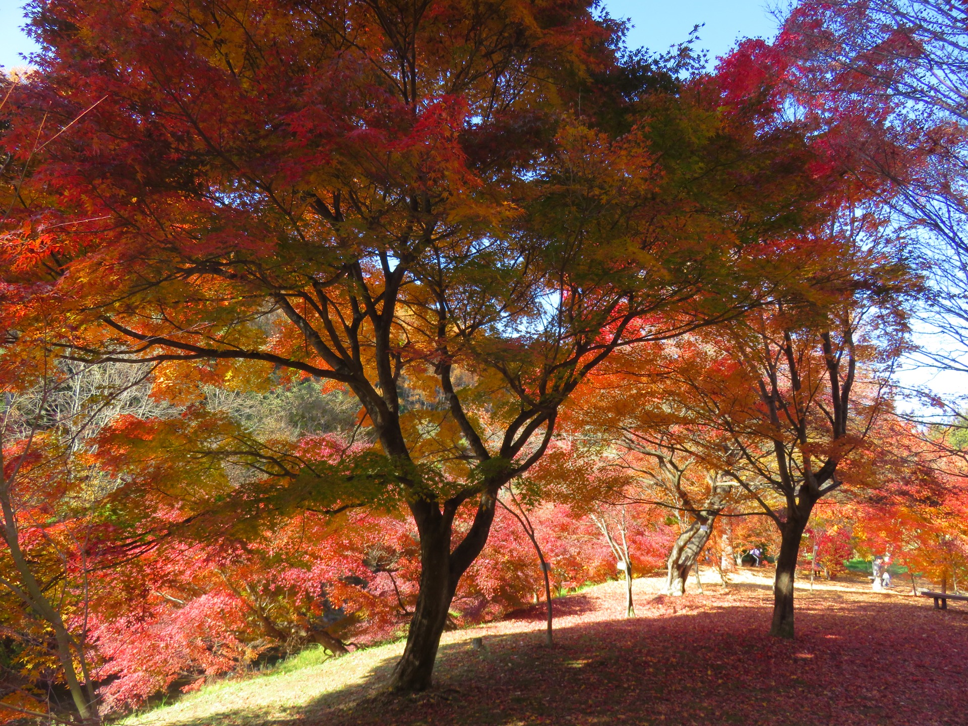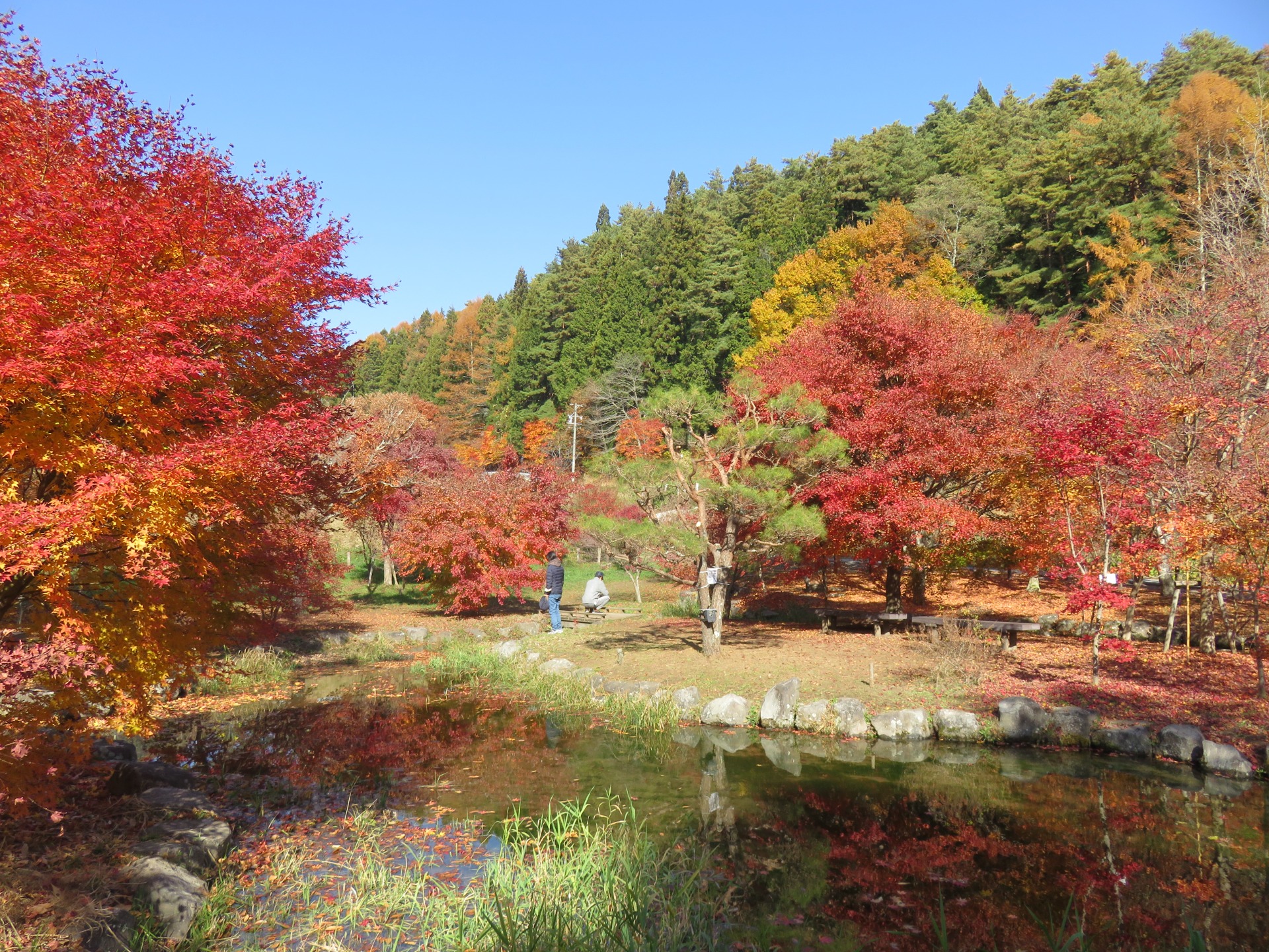 Just before the mountains closed in again around us on our way up to Matsumoto, we stopped at one more park, Izuhaya park, on the outskirts of Suwa. The colours here were vivid and the autumn sun was a deep yellow. The leaves were blowing slightly in the breeze and someof them were falling to the ground to join many others.