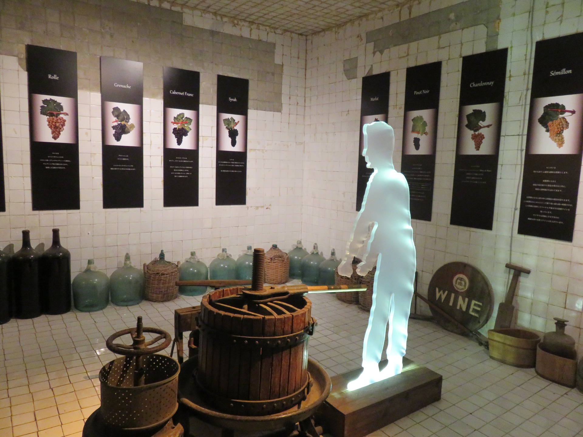 Making our way to the winery, we were just in time to catch the next tour. For 1000 yen, a man leads you round a historic winery, mainly underground, and talks about the process of making wine there historically, how the process came to Japan, shows you some interesting rooms and contraptions and then lets you drink a particularly astringent glass of wine. Not particularly encouraging for our future winery visits. The tour was worth it, however, as its the only place which gives tours in the area, that we found anyway.