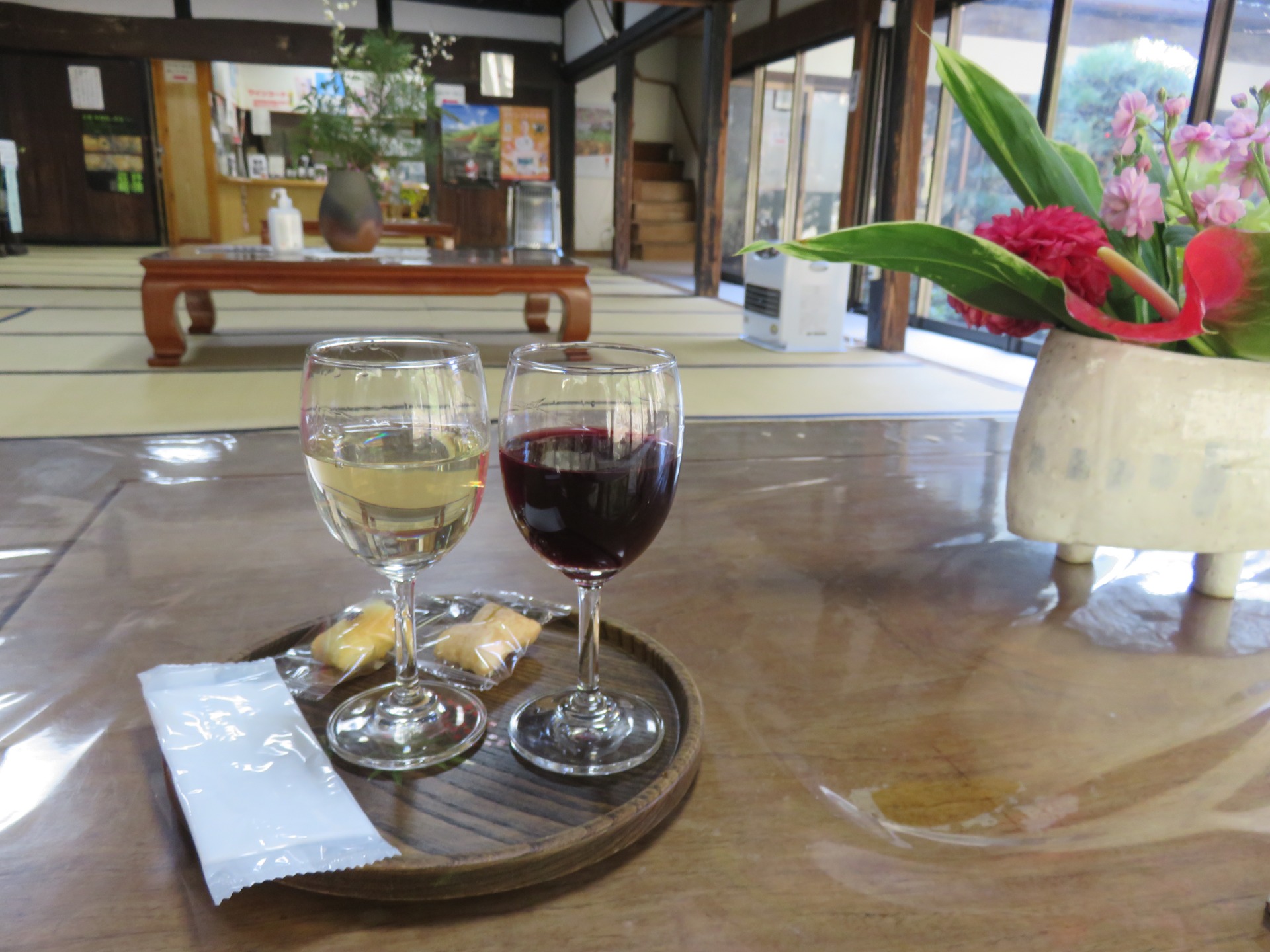 We got a taxi and went to the area with the most wineries near each other. The first one we went to was called Soryu Winery. They had two wine machines there. For 500 yen you got 3 tokens. One token gets you a sample of wine in a taster cup. We went through all the available wines and bought a bottle of white  which tasted the best.