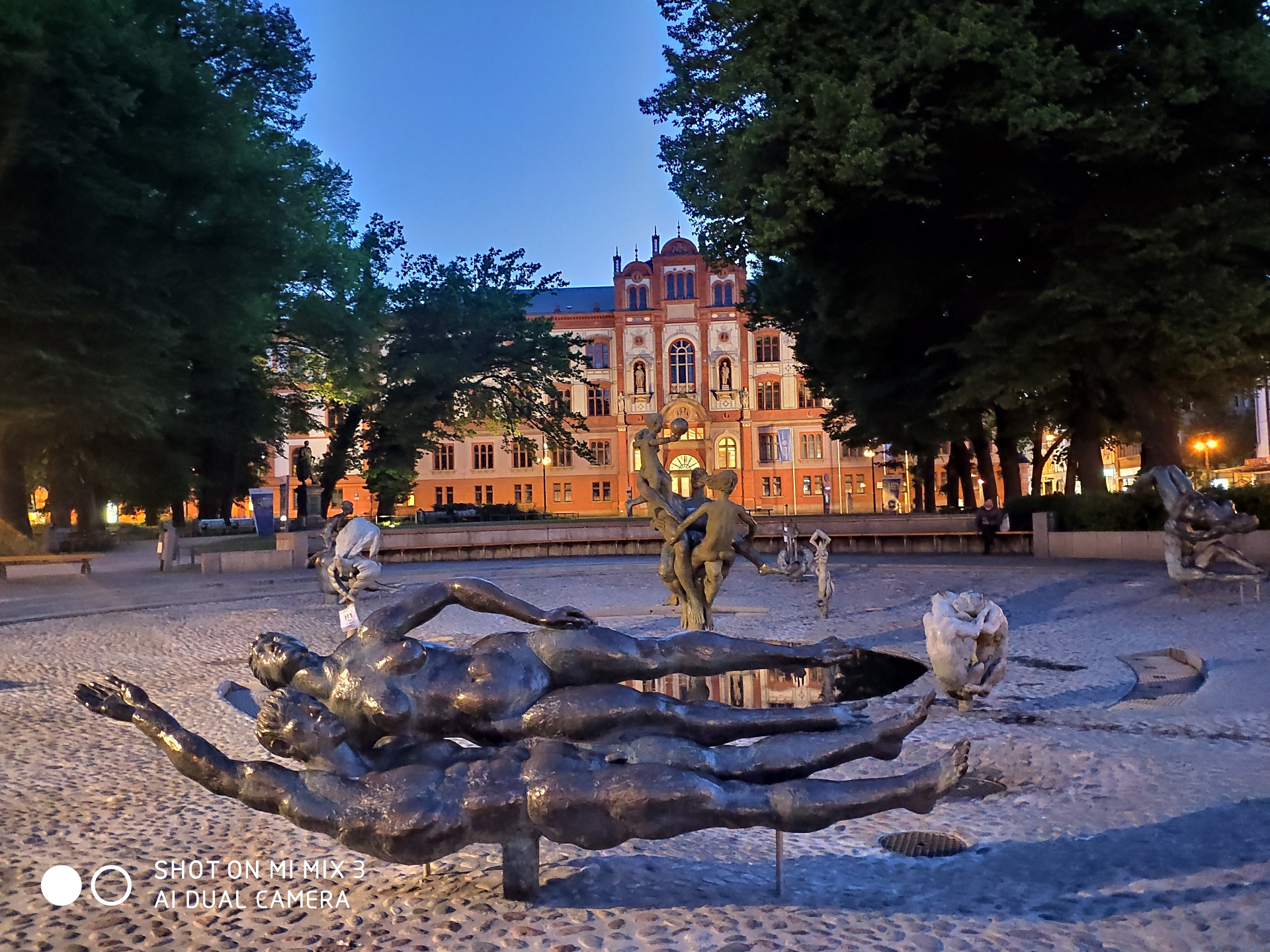 Directly at the market place is also the church and the town hall (the pink building). Everything frames the square like a circle. To get to the UN University we walked across the market place along a "big shopping mile" in Rostock, but even there we were after two minutes. In front of the university there was a fountain of joie de vivre, but in the evening it was just not employed anymore. What I noticed especially in Rostock: It was all very quiet and clean and there were only a few people on the street - a big contrast to Essen or Cologne.