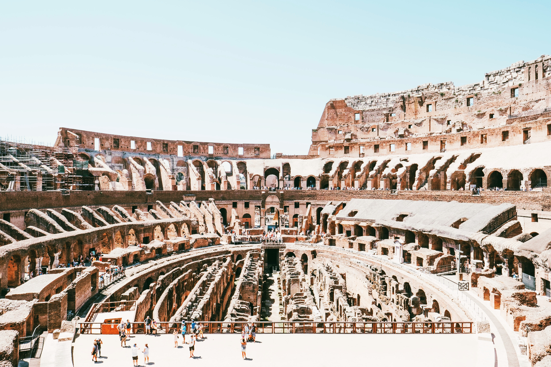Colosseum in Rome, ItalyBeneath the Colosseum arena were numerous corridors and rooms designed to house the gladiators and wild animals. These could be brought to the centre of the arena via lifts and stairways.