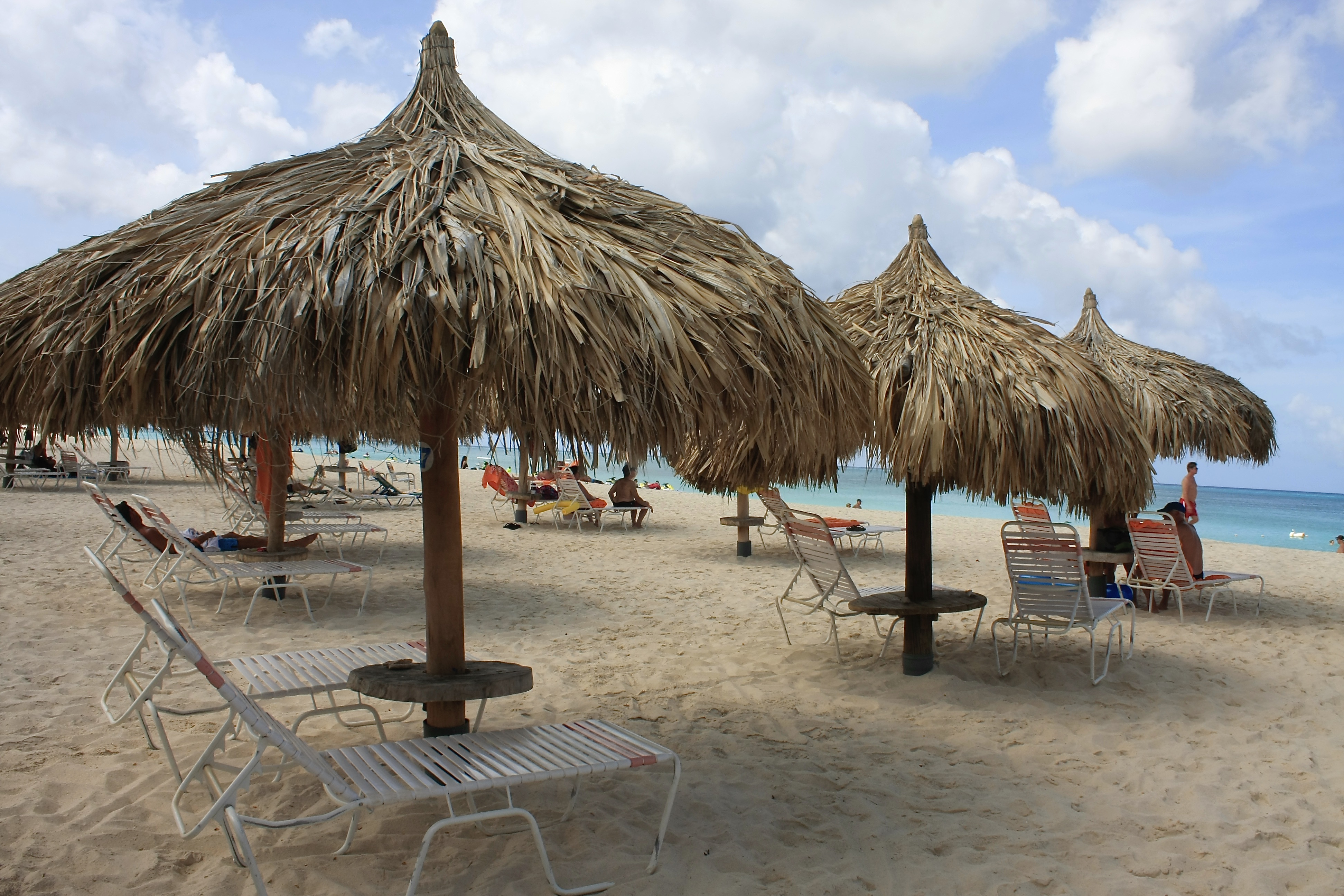 Eagle Beach is too crowded for my liking, but it is a very nice beach, to be sure. Parking is free and we had no difficulty finding a spot. There are plenty of straw umbrella huts, or you can rent an umbrella from a local beach stand and a nice young man will carry it out, dig a hole for it, and drop the umbrella, which has a small sand or cement cylinder at the base into the hole and plant it securely for you.